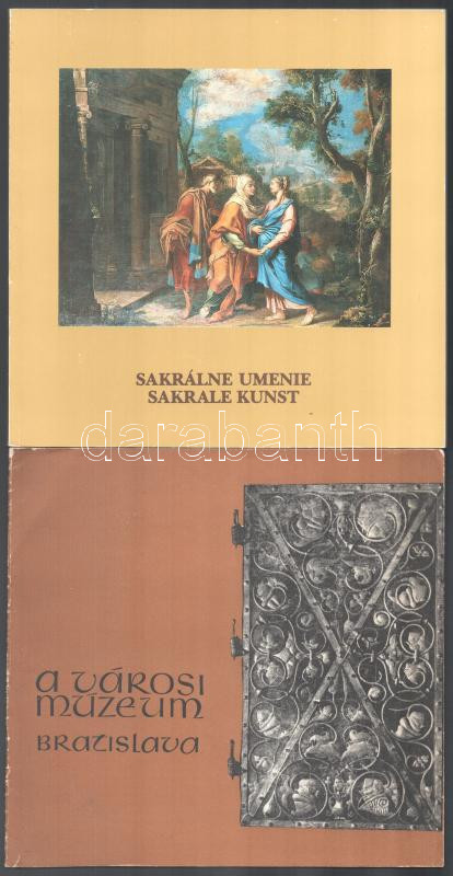 2 db pozsonyi múzeumi katalógus: Danuta Ucníková, Jindra Bakosová, Marta Janovícková: Sakrálne umenie a umelecke remeslo 14.-18. storocia na slovensku (...) - Sakrale Kunst und Kunsthandwerk vom 14.-18. Jahrhundert in der Slowakei aus den Sammlungen des Historischen Museums des Slowakischen Nationalmuseums. Pozsony, é.n., Historisches Museum des Slowakischen Nationalmuseums. Szlovák és német nyelven. 97 p. Megjelent 1500 példányban. Színes és fekete-fehér képekkel gazdagon illusztrált. Kiadói papírkötés. + Irena Topolská: Bratislava. A városi múzeum. Pozsony, 1966, Bratislavai Városi múzeum. 12 sztl. oldal. Fekete-fehér képekkel illusztrált katalógus. Kiadói papírkötésben.