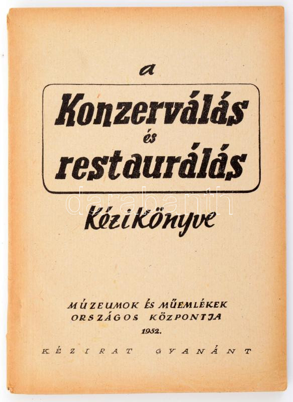 A konzerválás és restaurálás kézikönyve. Kézirat gyanánt. Szerk.: Lakos Lajos. Bp., 1952., Múzeumok és Műemlékek Országos Központja, 8+88 p. Kiadói papírkötés.