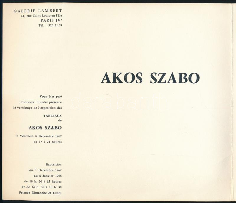 Akos Szabo. Paris, 1967, Galeria Lambert, 2 sztl. lev. Kiállítási kata... https://www.darabanth.com/de/472-Fernauktion/472.0/Bucher/Bucher-Architektur-Kunst~2000026/Akos-Szabo-Paris-1967-Galeria-Lambert-2-sztl-lev-Kiallitasi-katalogus~II3180688