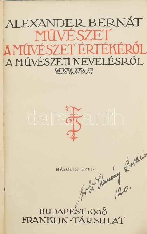 Alexander Bernát: Művészet. A művészet értékéről. A művészeti nevelésről. Bp., 1908, Franklin. Második ezer. Báró magyargyerőmonostori Kemény Boldizsár (1908-1983) névbejegyzésével a címlapon. Korabeli szecessziós egészvászon kötés, kissé kopott gerinccel és borítóval, laza kötéssel.