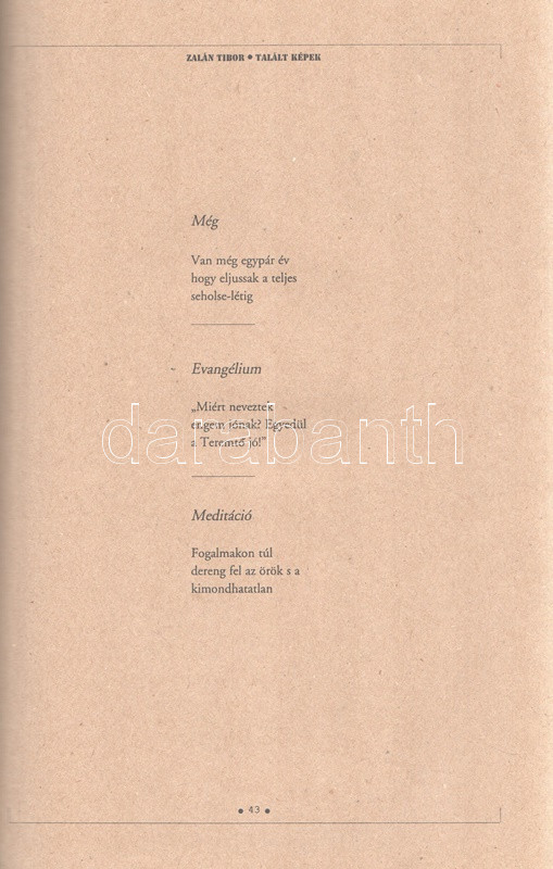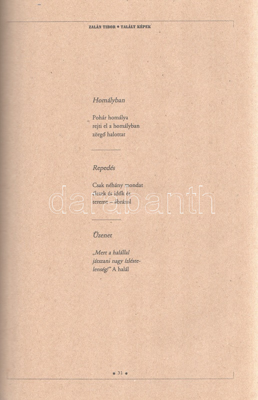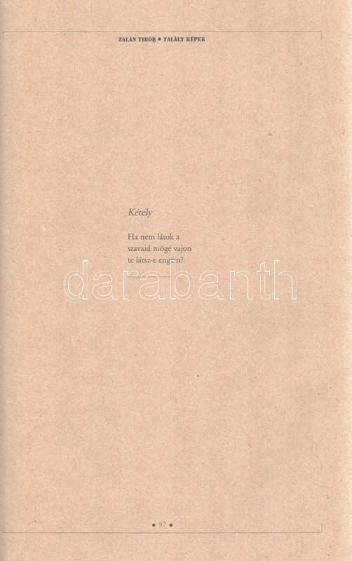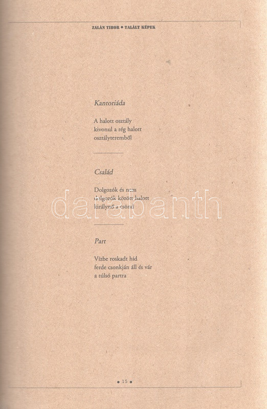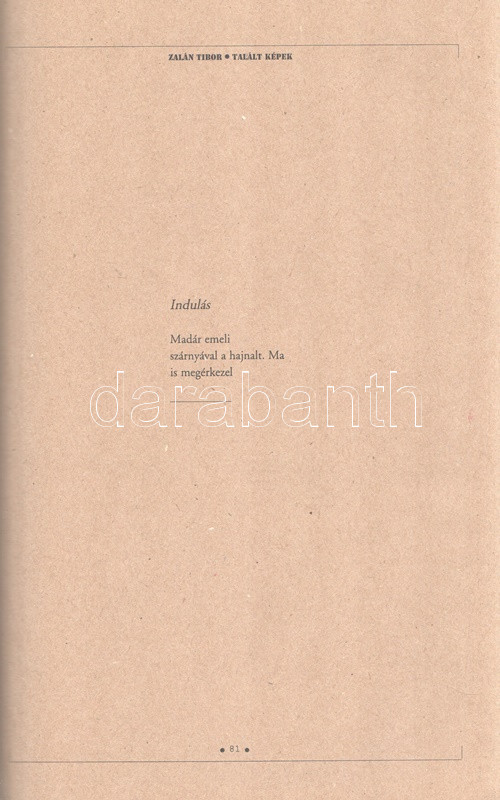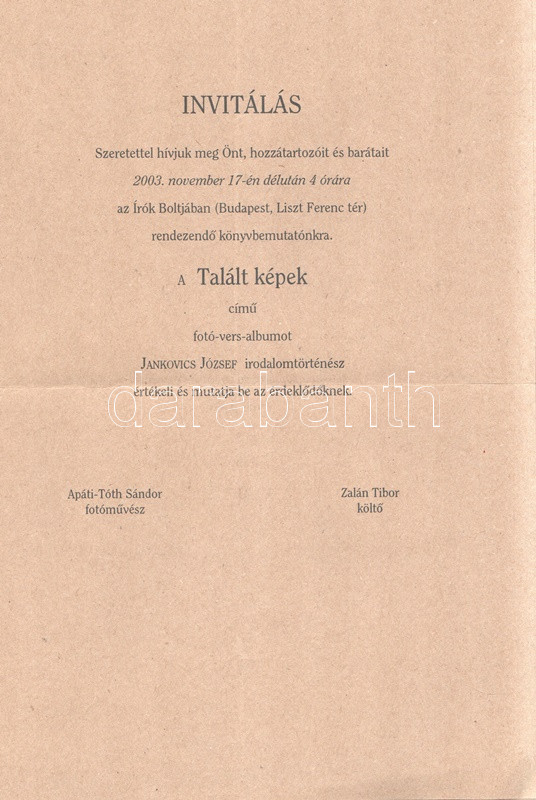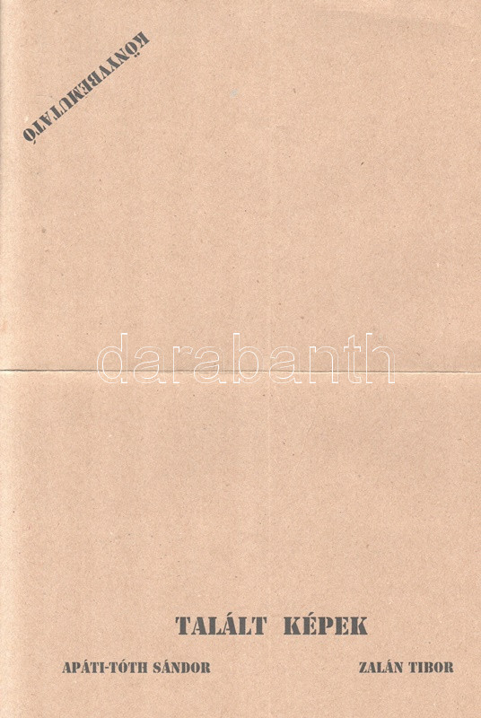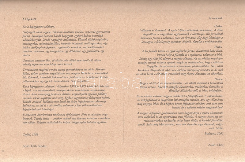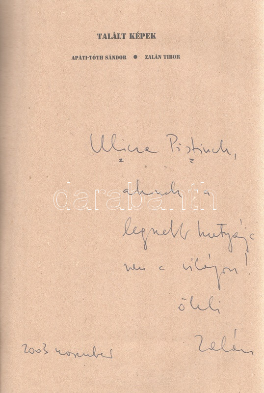 Apáti-Tóth Sándor - Zalán Tibor: Talált képek. (Fotó-vers-album.) [Zalán Tibor által dedikált példány.] (Cegléd, 2003. Apáti Bt. - Apáti Nyomda.) 97 + [5] p. ,,melléklet (meghívó). Egyetlen kiadás. Dedikált: ,,Vincze Pistinek, akinek a legszebb kutyája van a világon! Öleli Zalán 2003." Apáti-Tóth Sándor fényképkollázsait Zalán Tibor haiku versei kísérik. Japán fűzésű lapokkal. A kötetben elhelyezve a könyvbemutatóra szóló meghívó: a kötetet 2003. november 17-én mutatták be a budapesti Írók Boltjában, a munkát Jankovics József irodalomtörténész méltatta. Prov.: Vincze István. [Vincze István (1922-1982) néprajztudós, 1955-től a Néprajzi Múzeum munkatársa, 1980-től osztályvezetője. Főként szőlészet- és borászattörténettel foglalkozott.] Fűzve, illusztrált kiadói borítóban. Jó példány.