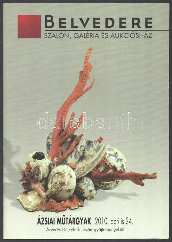 Ázsiai műtárgyak. Árverés Dr Zelnik István gyűjteményéből. Szerk.: Forró Judit. Bp., 2010, Belvedere Szalon. 40 p. A szegedi Reök-palotában rendezett kiállítás katalógusa. Gazdag képanyaggal illusztrált katalógus. Kiadói papírkötés, jó állapotban.
