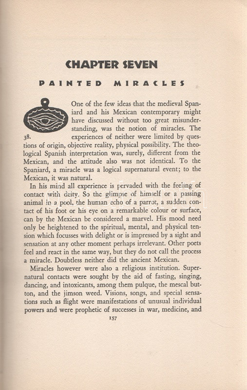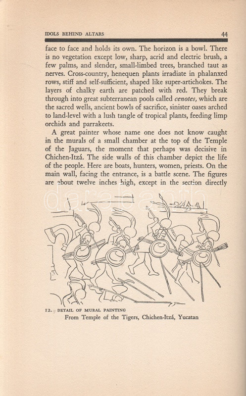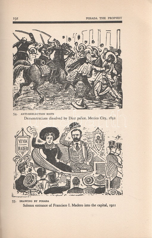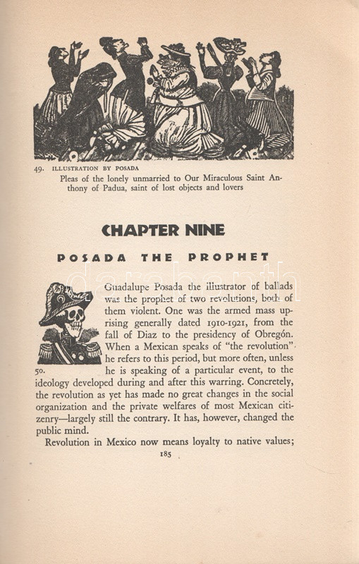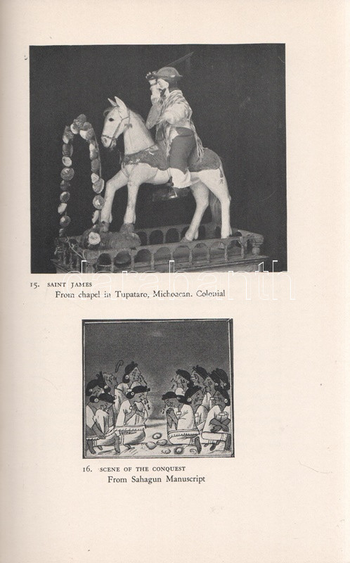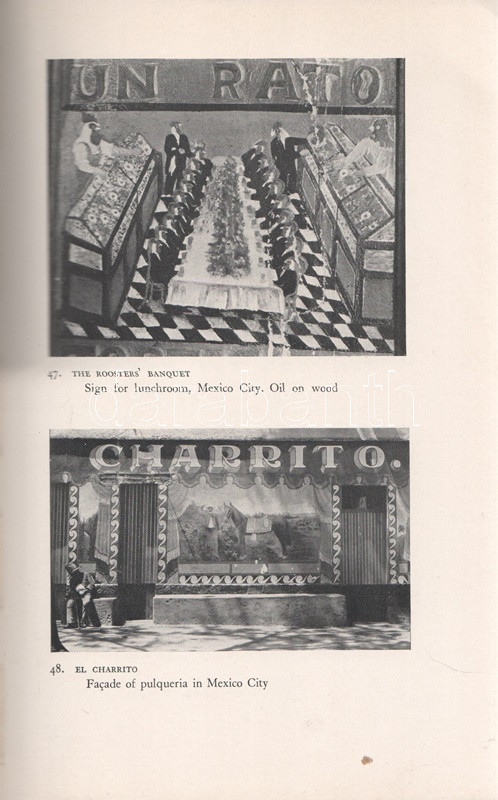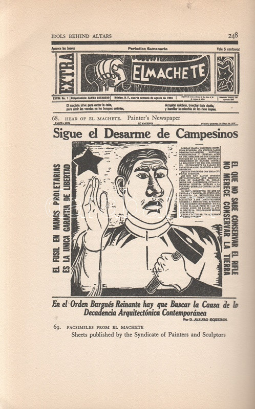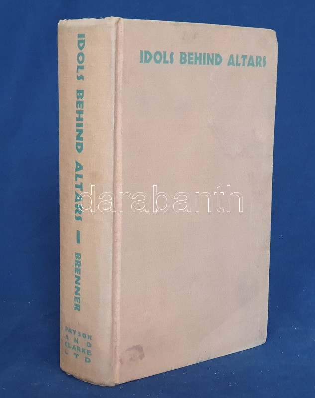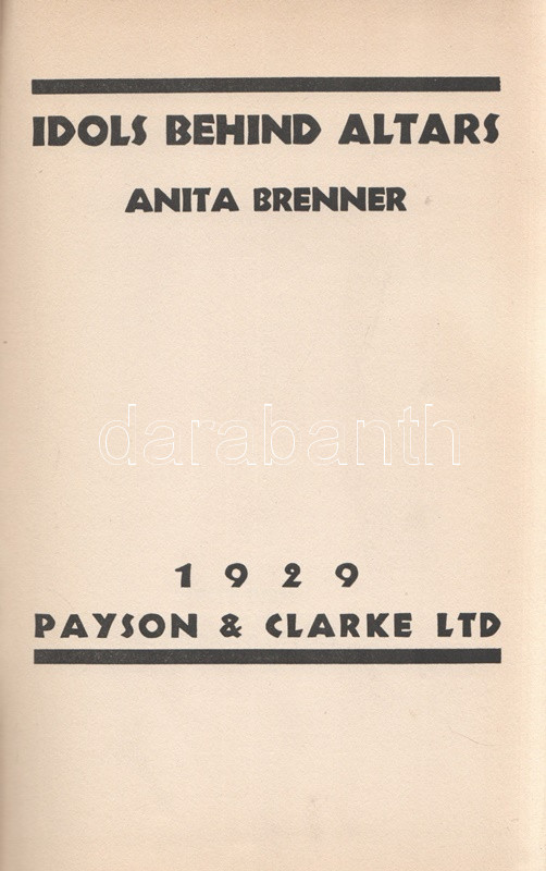Brenner, Anita: Idols Behind Altars. New York, 1929. Payson & Clarke Ltd. (Printed by J. J. Little and Ives Company). 1 t. (címkép) + 359 + [1] p. + 54 t. Első kiadás. Anita Brenner (1905-1974) lettországi bevándorlóktól származó mexikói antropológus, újságíró, munkássága java Mexikó társadalomtörténetével, kultúrájával és művészetével foglalkozik. 1929. évi kötetében, első önálló könyvében, illetve élete fő művében a gyarmati spanyol hatások által nagyrészt elfedett, önálló életre kelt mexikói művészet társadalomtörténetét nyomozza, az azték hagyományoktól a konkvisztárodok korán át, a gyarmati időktől egészen a mexikói forradalmak és polgárháborúk (1910-1920) utáni időszakig. Anita Brenner monográfiája élő hagyományként mutatja be az azték és gyarmati örökség sajátos keveredését a Mexikóban különösen erős munkásmozgalmi kultúrformákkal. Kötete legerőteljesebb része a kortárs mexikói avantgárd képzőművészet bemutatása, melynek latinosan kozmopolita köreiben a szerző maga is forgott. A mexikói kultúrtörténet megkerülhetetlen kötete, oldalszámozáson belül számos szövegközti illusztrációval díszítve. Feliratozott, enyhén foltos kiadói egészvászon kötésben. Jó példány.