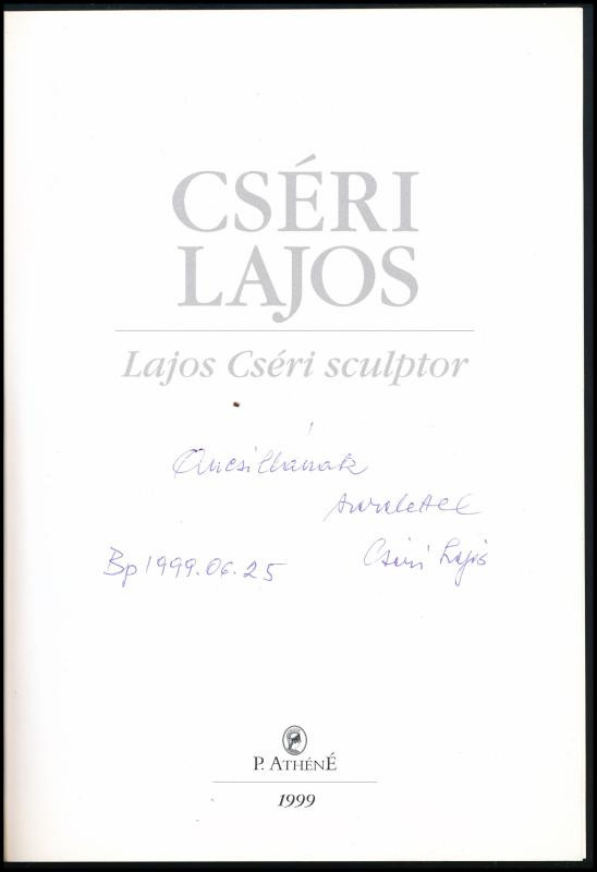 Cséri Lajos. Lajos Cséri sculptor. Cséri Lajos (1928-2020) érem-, szobrászművész által DEDIKÁLT! Göd, 1999, P. Athéné, 48 p. Számozott (00029. sz. példány). Gazdag képanyaggal illusztrált. Kiadói papírkötés.