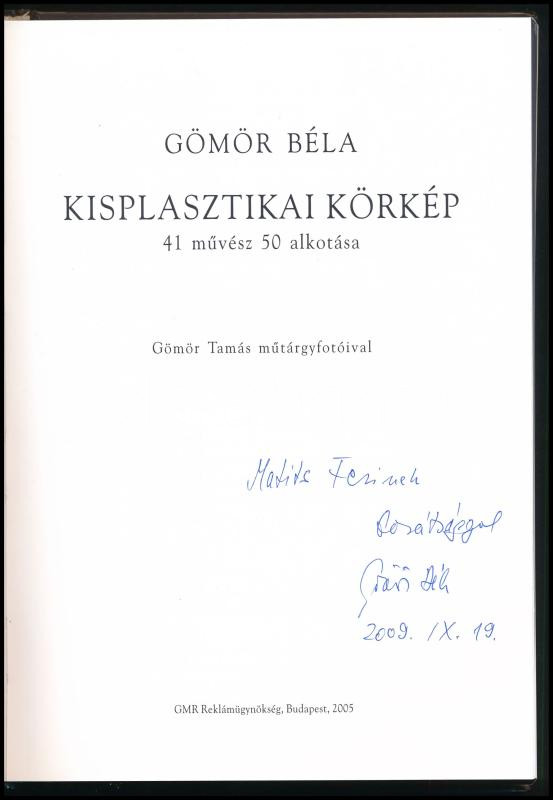 Gömör Béla: Kisplasztikai körkép. 41 művész 50 alkotása. A szerző, Gömör Béla által Matits Ferenc művészettörténész, művészeti író, egyetemi tanárnak DEDIKÁLT! Bp., 2005, GMR Reklámügynökség. 114+1 p. Gazdag képanyaggal illusztrált. Benne Csíkszentmihályi Róbert, Fajó János, Ferrenczy Béni, Kass János, Kisfaludi Strobl Zsigmond, Kő Pál, Mattis Teutsch János, Medgyessy Ferenc, és mások. Kiadói kartonált papírkötés.