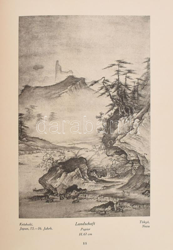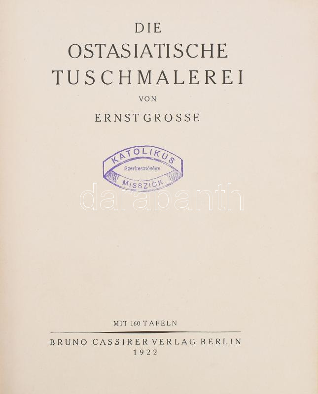 Grosse, Ernst: Die Ostasiatische Tuschmalerei. Die Kunst des Ostens Band VI. Berlin, 1922, Bruno Cassirer. Gazdag fekete-fehér képanyaggal illusztrálva. Német nyelven. Kiadói aranyozott félvászon-kötés, "Katolikus Missziók Szerkesztősége" bélyegzőjével.