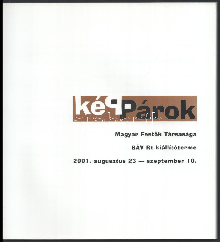 Képpárok - Magyar Festők Társasága. BÁV Rt. kiállítóterme 2001.aug. 23 - szeptember 10.. H.n, é.n., k.n.. 12 sztl. oldal. Színes képekkel, többek közt Barabás Márton, El Kazovszkij, Matzon Ákos, Tenk László műveinek reprodukcióival illusztrált kiállítási katalógus. Kiadói papírkötés, jó állapotban.