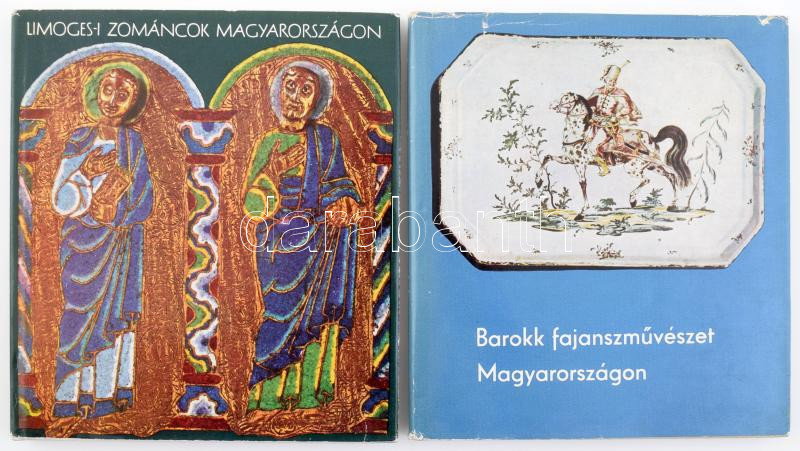 Kiss Ákos: Barokk fajanszművészet Magyarországon. Holics és Tata. Bp., 1966, Corvina. Gazdag fekete-fehér és színes képanyaggal illusztrált. Kiadói egészvászon kötésben, javított kiadói papír védőborítóban. Megjelent 1950 példányban. + Kovács Éva: Limopges-i zománcok Magyarországon. Bp., 1968, Corvina. Gazdag fekete-fehér és színes képanyaggal illusztrált. Kiadói egészvászon kötésben, kiadói papír védőborítóban. Megjelent 2200 példányban.;