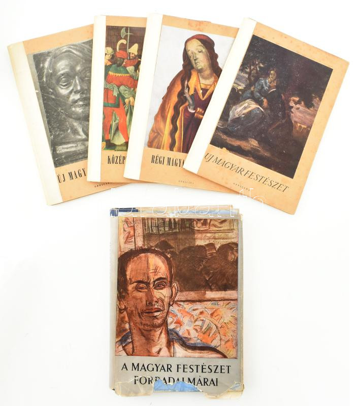 Magyar művészet I-IV. köt. I. köt.: Kopp Jenő: Uj magyar festészet. Bp., [1948.], Officina, 36 p. 13. oldaltól színes képanyaggal illusztrált. Közte: Markó Károly, Barabás Miklós, Lotz Károly, Benczur Gyula, Munkácsi Mihály, Paál László, Mednyánszky László, Szinyei-Merse Pál, Ferenczy Károly, Csók István, Rippl-Rónai József, Gulácsy Lajos, Berény Róbert, Szőnyi István, Czóbel Béla, Derkovits Gyula, Márffy Ödön, és mások képeivel.; II. köt.: Kampis Antal: Régi magyar szobrászat. Bp., (1948.), Officina, 19+5 p.+32 (fekete-fehér képtáblák) t.; III. köt.: Genthon István: Középkori magyar festészet. Bp., (1948.), Officina, 13+2 p. + +32 (fekete-fehér képtáblák) t.; IV. köt.: Vargha Balázs: Új magyar szobrászat. Bp., (1948.), Officina, 15+1 p. + +32 (fekete-fehér képtáblák) t.; Kiadói kartonált papírkötések, kissé kopott, kissé foltos borítókkal, javított gerincekkel. + Pogány Ö. Gábor: A magyar festészet forradalmárai. Ars Mundi X. Bp., [1947], Officina, 192 p. Gazdag fekete-fehér és színes képanyaggal illusztrálva. Kiadói aranyozott félvászon-kötés, kiadói papír védőborítóban, kopott borítóval, sérült, hiányos, javított papírborítóval.