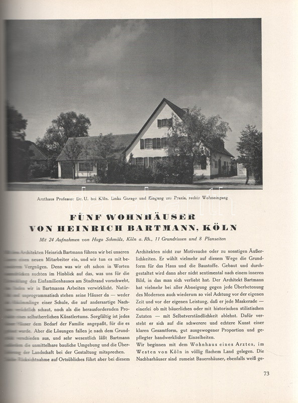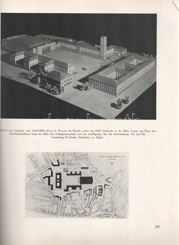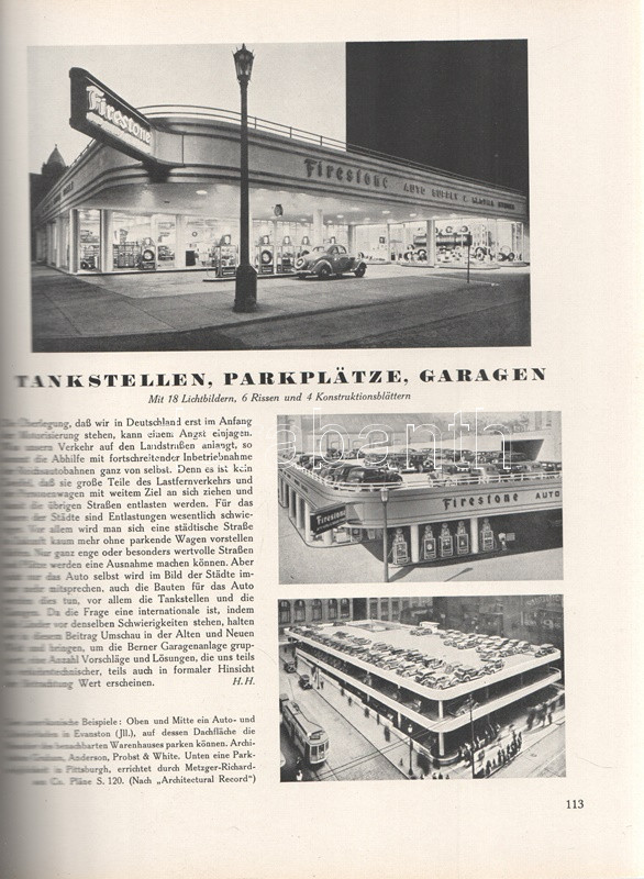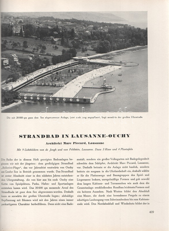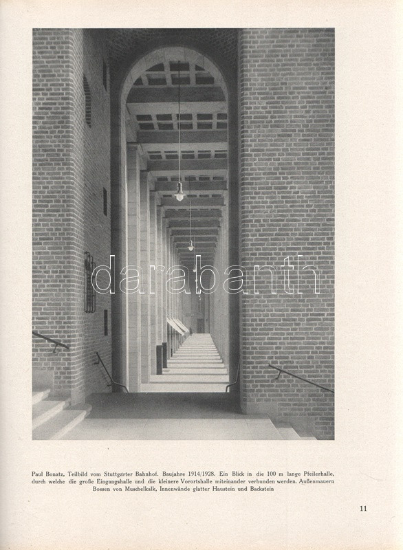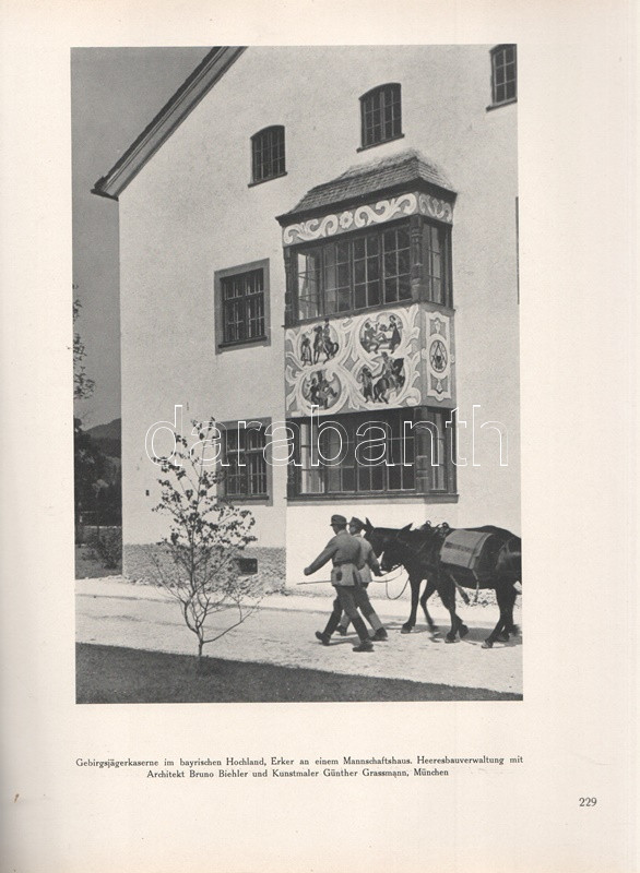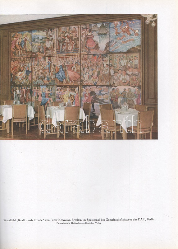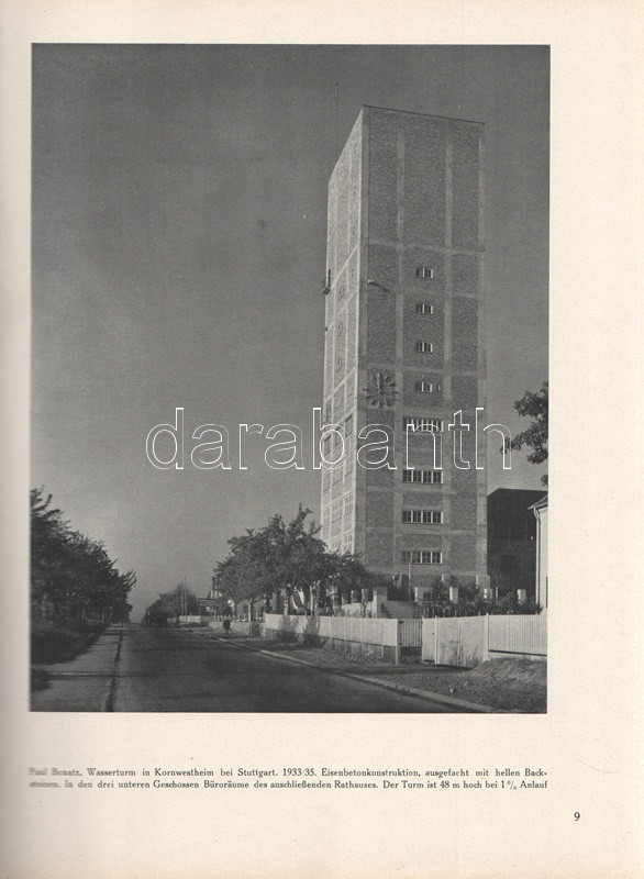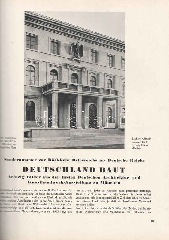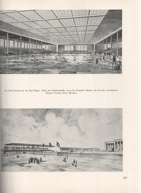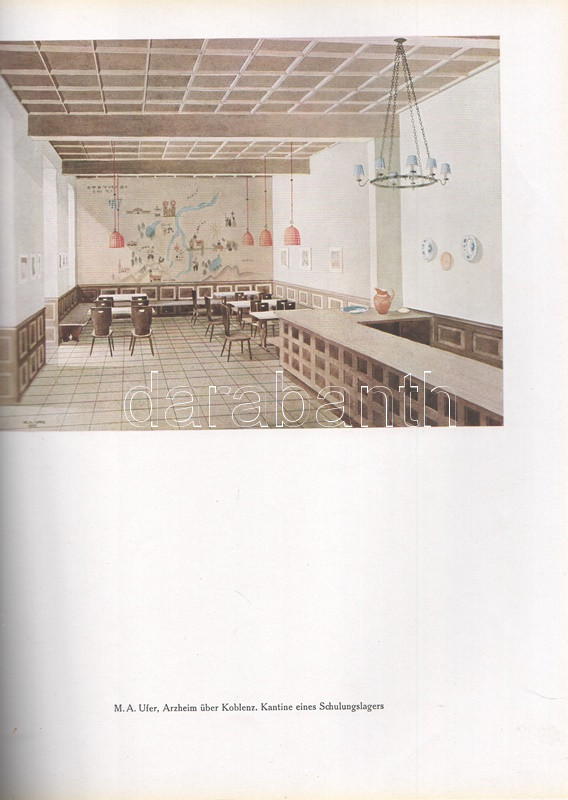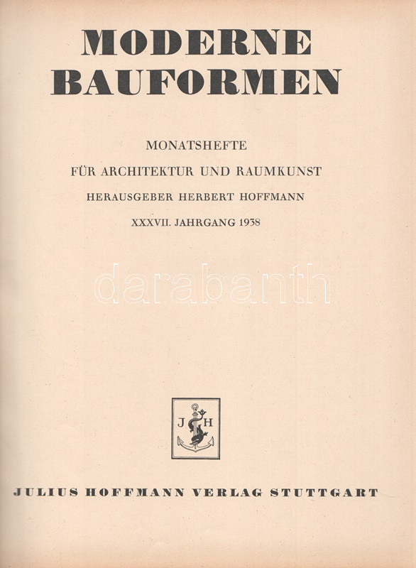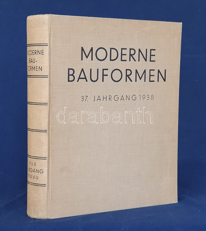Moderne Bauformen. Monatshefte für Architektur und Raumkunst. Herausgegeber Herbert Hoffmann. XXXVII. Jahrgang. [Teljes évfolyam, egybekötve.] (1938) Stuttgart, 1938. Verlag Julius Hoffmann (Druck der Hoffmanschen Buchdruckerei Felix Krais - Stuttgarter Vereinsbuchdruckerei AG. - Omnitypie-Gesellschaft Nachf. Leopold Zechnall). XV + [1] + 680 p. + 31 t. (29 színes, egy kihajtható). Julius Hoffmann modernista építészeti, belsőépítészeti, urbanisztikai és iparművészeti képes havi folyóirata 1902-1944 között jelent meg, oldalszámozáson belül rövidebb építészeti cikkekkel és igen gazdag fotóanyaggal, homlokzatrajzokkal, keresztmetszeti és alaprajzokkal, típustervekkel. A folyóirat 1933 előtt kimondottan a modernista, Bauhaus-elvű építészet eredményeit tette közzé, 1933-at követően belsőépítészetben és bútorművészetben modernista marad, ám a németországi villa- és középület-építészet elvei kissé megváltoznak, egy rendelet miatt, amely 1933-as dátummal betiltotta a lapos tetős építkezést, annak vélelmezetten züllött szelleme miatt - az uralomra jutó nemzetiszocialista vezetés legalábbis annak tartotta a Bauhaust. A lapos tetős, Bauhaus-elvű építkezést folyóiratunkban így csupán a külföldi - dán, francia, cseh, osztrák épületekben tanulmányozhatjuk, a németországi lakó-, iskola- és irodaépületek - a monumentális kiállítási és sportlétesítményeket leszámítva - sátortetővel készültek. Ezzel párhuzamosan a belsőépítészeti megoldások között feltűnnek az ónémetnek vélt rönképítkezés, a rusztikus bútortervezés elemei: különösen az egyedi német nemzeti szellemet sugalló ifjúsági szállások, fogadók esetében, illetve feltűnő kettős jelenség a népi jelenteket megjelenítő, figurális falfestészet feltűnése, illetve a falfelületek térképekkel való borítása. Évfolyamunk megszaporodik az állampárthoz kötődő épületek száma, a kapcsolódó ikonográfiai elemekkel, sas- és szvasztikamotívumok minduntalan feltűnnek épülethomlokzatokon, enteriőrökben és zászlókon. A birodalmi esztétikától eltérő elveket sugall viszont az évfolyam strand-összeállítása, a külföldi: norvég, lengyel, spanyol strandok továbbra is telivér Bauhaus-épületek, a németországi töltőállomások pedig továbbra is a lapos tetős modernizmus - a birodalmi autópályák pedig a monumentalitás jegyében épülnek. Feliratozott kiadói egészvászon kötésben. Jó példány.