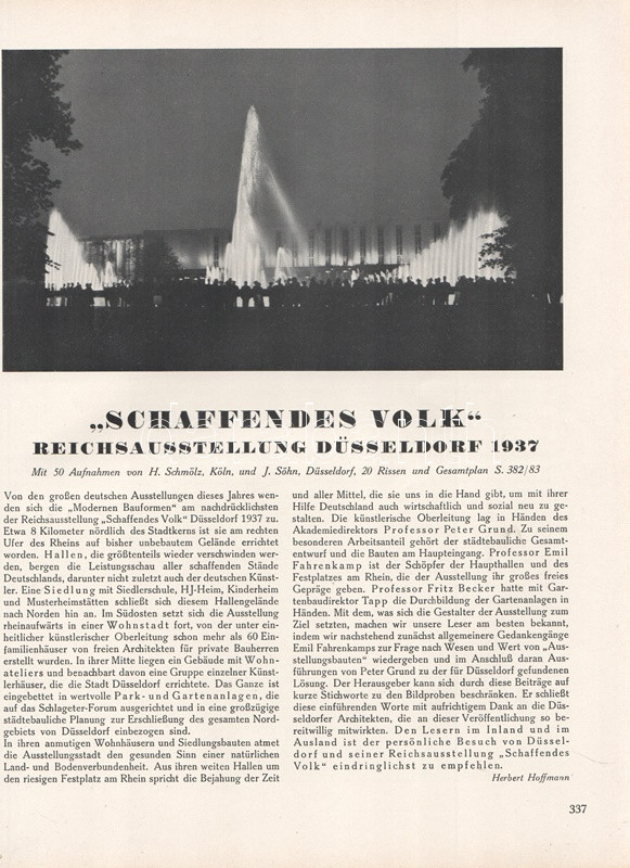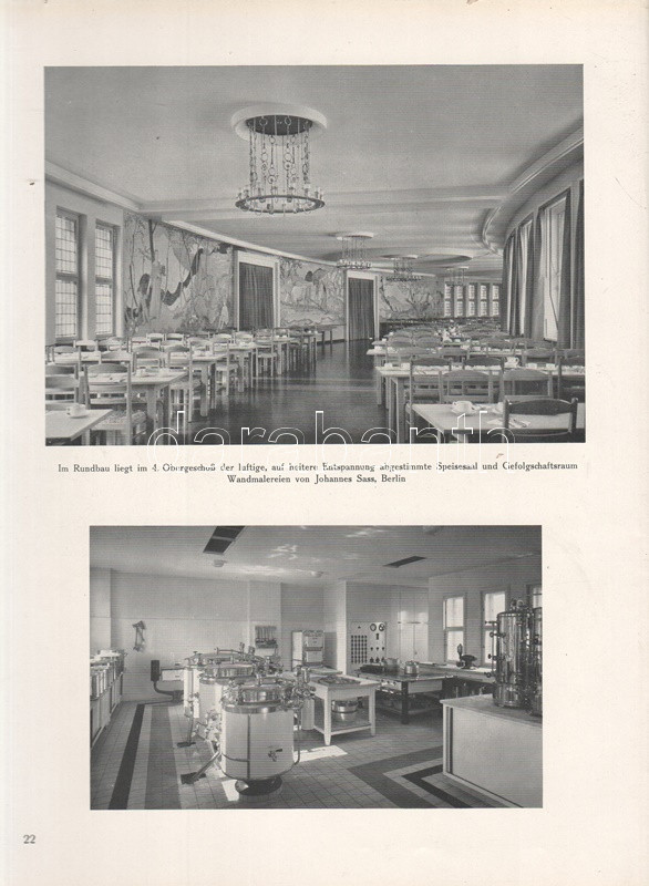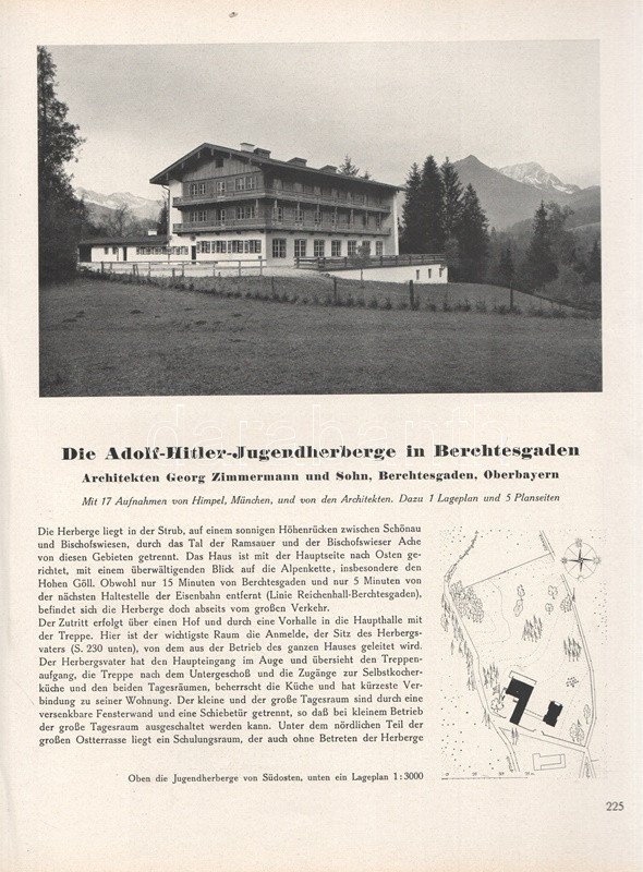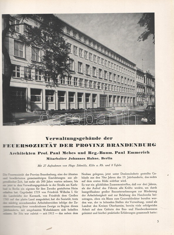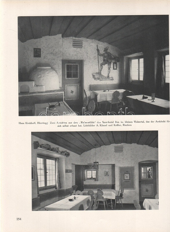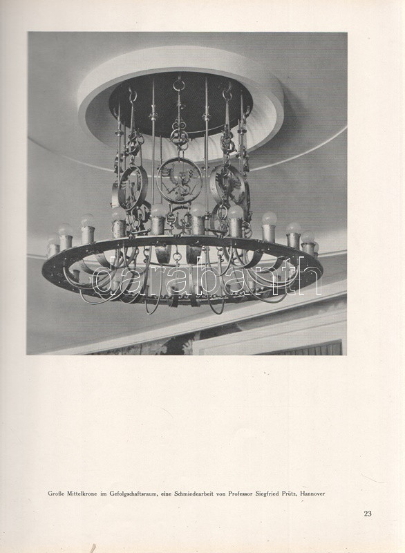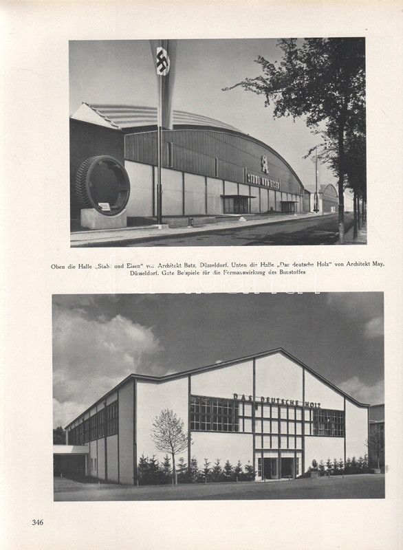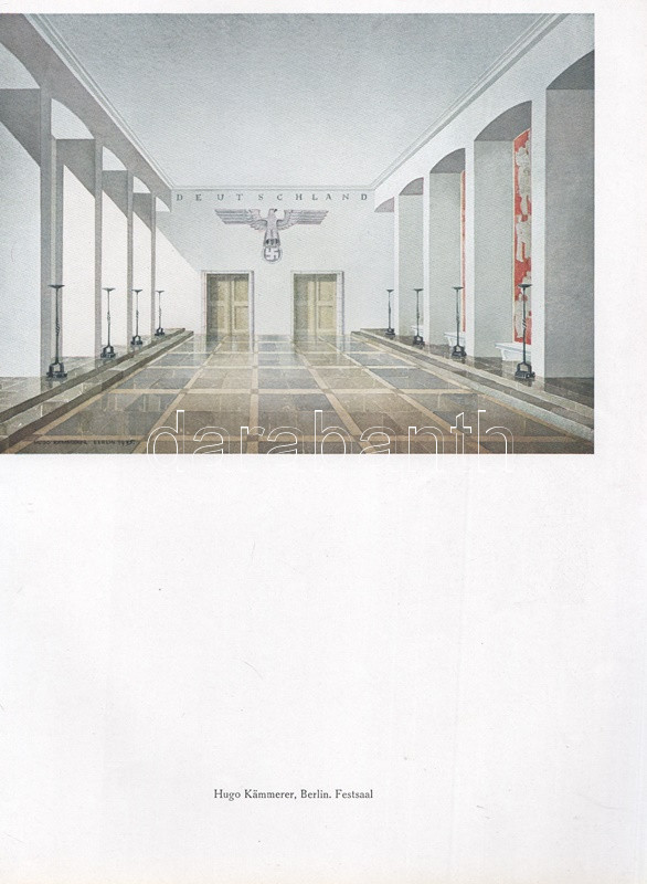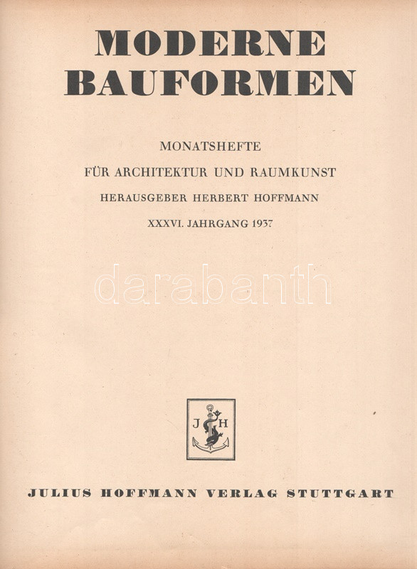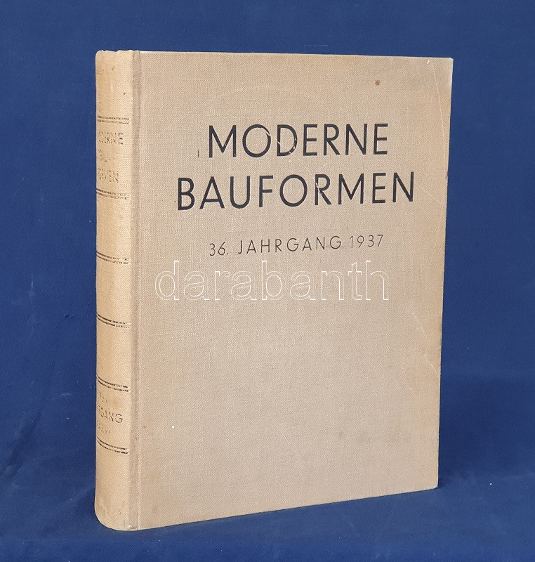 Moderne Bauformen. Monatshefte für Architektur und Raumkunst. Herausgegeber Herbert Hoffmann. XXXVI. Jahrgang. [Teljes évfolyam, egybekötve.] (1937) Stuttgart, 1937. Verlag Julius Hoffmann (Druck der Hoffmanschen Buchdruckerei Felix Krais - Stuttgarter Vereinsbuchdruckerei AG. - Omnitypie-Gesellschaft Nachf. Leopold Zechnall). XV + [1] + 652 p. + 29 t. (színes) + 1 térkép (kétszínnyomású). Julius Hoffmann modernista építészeti, belsőépítészeti, urbanisztikai és iparművészeti képes havi folyóirata 1902-1944 között jelent meg, oldalszámozáson belül rövidebb építészeti cikkekkel és igen gazdag fotóanyaggal, homlokzatrajzokkal, keresztmetszeti és alaprajzokkal, típustervekkel. A folyóirat 1933 előtt kimondottan a modernista, Bauhaus-elvű építészet eredményeit tette közzé, 1933-at követően belsőépítészetben és bútorművészetben modernista marad, ám a németországi villa- és középület-építészet elvei kissé megváltoznak, egy rendelet miatt, amely 1933-as dátummal betiltotta a lapos tetős építkezést, annak vélelmezetten züllött szelleme miatt - az uralomra jutó nemzetiszocialista vezetés legalábbis annak tartotta a Bauhaust. A lapos tetős, Bauhaus-elvű építkezést folyóiratunkban így csupán a külföldi - dán, francia, cseh, osztrák építőművészet példáiban tanulmányozhatjuk, a németországi lakó-, iskola- és irodaépületek - a monumentális kiállítási és sportlétesítményeket leszámítva - sátortetővel készültek. Ezzel párhuzamosan a belsőépítészeti megoldások között feltűnnek az ónémetnek vélt rönképítkezés, a rusztikus bútortervezés elemei (Adoph Hitler-Jugendherberge), illetve a népi jeleneteket megjelenítő, figurális falfestészet darabjai. Évfolyamunkban több urbanisztikai cikk is születik, Koppenhága jelenlegi, illetve München és Drezda történelmi urbanisztikájáról. Lapszámaink beszámolnak az 1937. évi düsseldorfi építészeti kiállításról, és hosszan méltatják Németország kiállítási épületeit a párizsi kiállításon: a német birodalmi építészet monumentális jellege azonnal felmérhető a képeken, csakúgy, mint a Nürnbergbe - a mozgalom városába - tervezett Német Stadion épületcsoportján. Példányunk középső íveinek fűzése - a 287. és 498. oldal között - meglazult. Feliratozott kiadói egészvászon kötésben.