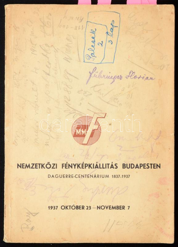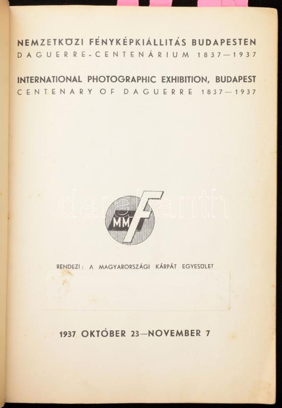 Nemzetközi fényképkiállítás Budapesten. Daguerre-Centenárium 1837-1937. 1937 október 23 - november 7. International Photographic Exhibition, Budapest. Centenary of Daguerre 1837-1937. Bp., 1937, Magyaországi Kárpát Egyesület, 1 (fekete-fehér fotó) t. +20 p.+4 (fekete-fehér fotók, kétoldalas képtáblák) t.+8 p. Korabeli reklámokkal. A kiállítási bizottságban: Aszmann Ferenc, Pécsi József...stb. A zsűri tagok között Vadas Ernő, Kinszki Imre...stb. Benne a kiállítók között szintén nagy nevekkel, Brassai, Aszmann Ferenc, Escher Károly, Munkácsi Márton, Pécsi József, Kinszki Imre, Vadas Ernő és mások. Kiadói papírkötés, foltos borítóval, a borítón számos bejegyzésekkel. Ritka!