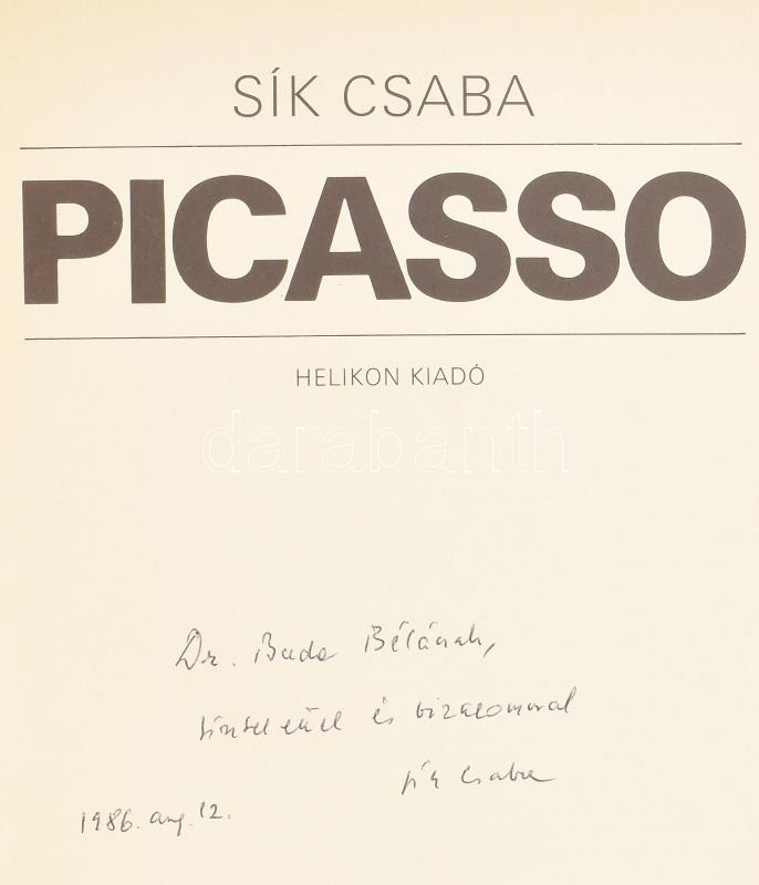 Sík Csaba: Picasso. (DEDIKÁLT). Bp., 1985, Helikon. Első kiadás. Fekete-fehér és színes képekkel illusztrálva. Kiadói egészvászon-kötés, kiadói papír védőborítóban. A szerző, Sík Csaba (1934-1997) művészeti író, kritikus, művészettörténész által Dr. Buda Béla (1939-2013) orvos, pszichiáter részére DEDIKÁLT példány.