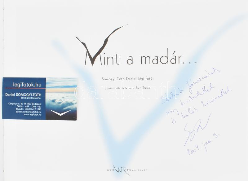 Somogyi-Tóth Dániel: Mint a madár ... - -légi fotói. DEDIKÁLT! A szerző névjegykártyájával. Szerk. és terv. Futó Tamás. Esterházy Péter előszavával. Miskolc, 2003., Well-PRess Kiadó Kft. Gazdag képanyaggal illusztrált. Kiadói egészvászon-kötés, kiadói papír védőborítóban.