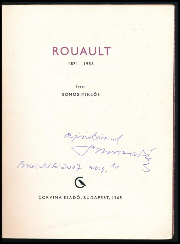 Somos Miklós: Rouault 1871-1958. A szerző, Somos Miklós által DEDIKÁLT! A Művészet Kiskönyvtára LXI. Bp., 1965, Corvina. Kiadói papírkötés, kiadói kissé sérült papír védőborítóval.