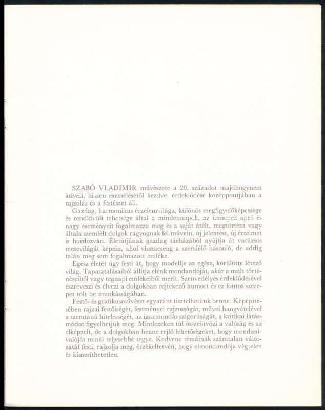 Szabó Vladimir. (Kiállítási katalógus). Balassagyarmat, 1985, Balassagyarmat Város Tanácsa - Nógrád Megyei Múzeumok Igazgatósága. Kiadói tűzött papírkötés. Megjelent 1000 példányban.