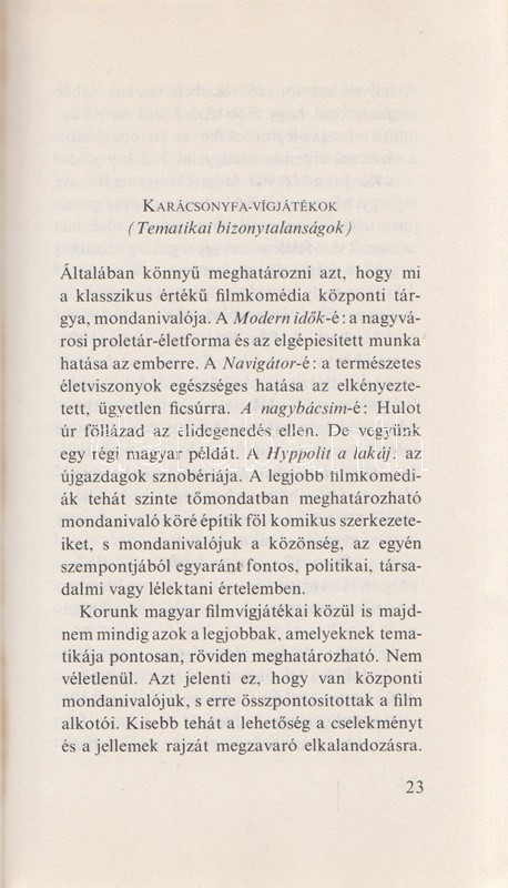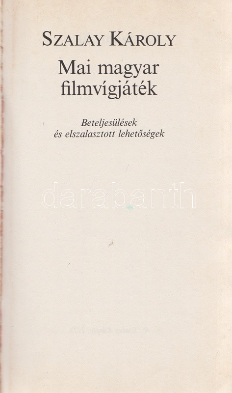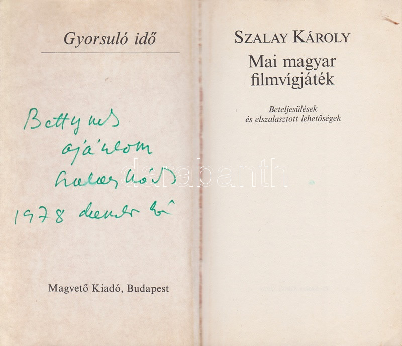 Szalay Károly: Mai magyar filmvígjáték. Beteljesülések és elszalasztott lehetőségek. (Dedikált.) (Budapest, 1978. Magvető Könyvkiadó - Dabasi Nyomda). 195 + [5] p. Egyetlen kiadás. Dedikált: ,,Bettynek ajánlom, Szalay Károly. 1978 december hó". (Gyorsuló idő.) Fűzve, színes, illusztrált, enyhén foltos kiadói borítóban.
