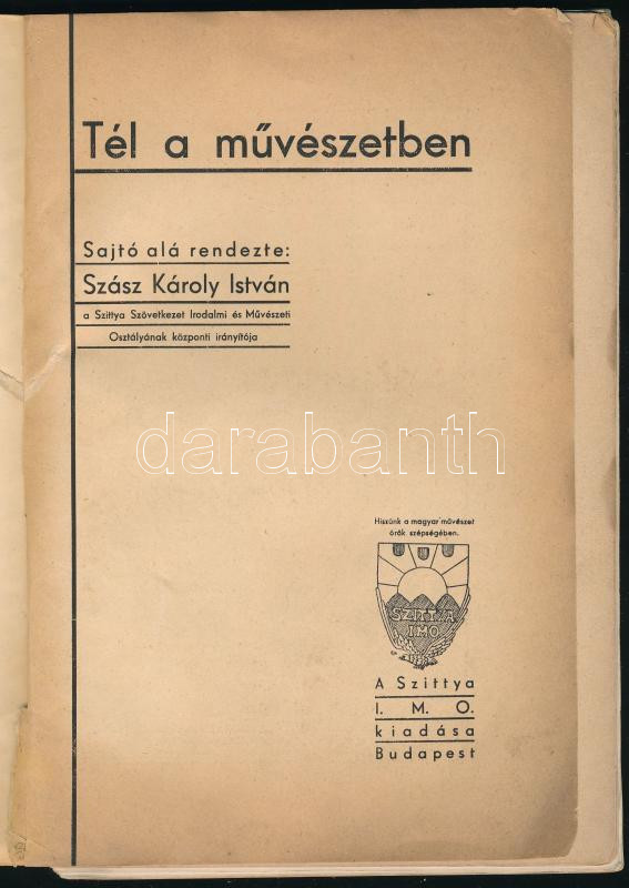 Tél a művészetben. Sajtó alá rendezte: Szász Károly István. Bp., én.,Szittya I. M. O., (Szalay Sándor-ny.), 100 p. Fekete-fehér fotókkal illusztrált. Kiadói papírkötés, kopott, foltos, szakadt borítóval, kissé sérült fűzéssel.