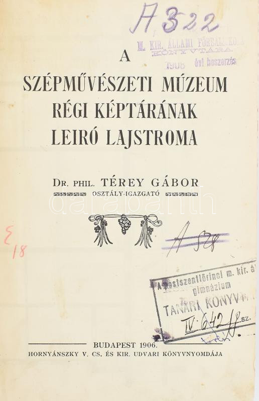 Térey Gábor: A Szépművészeti Múzeum régi képtárának leíró lajstroma. B... https://www.darabanth.com/de/472-Fernauktion/472.0/Bucher/Bucher-Architektur-Kunst~2000026/Terey-Gabor-A-Szepmuveszeti-Muzeum-regi-keptaranak-leiro-lajstroma-Bp-1906-Hornyans~II3184438
