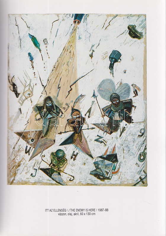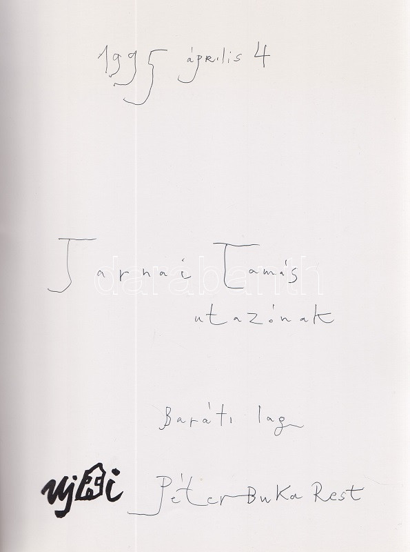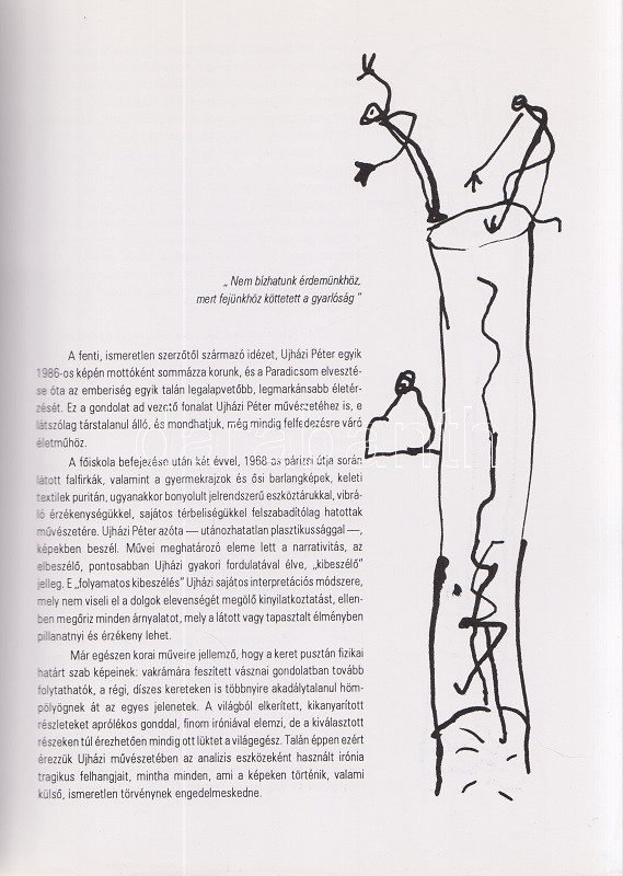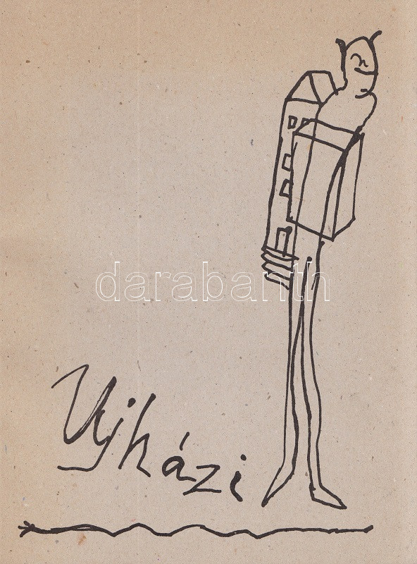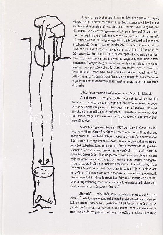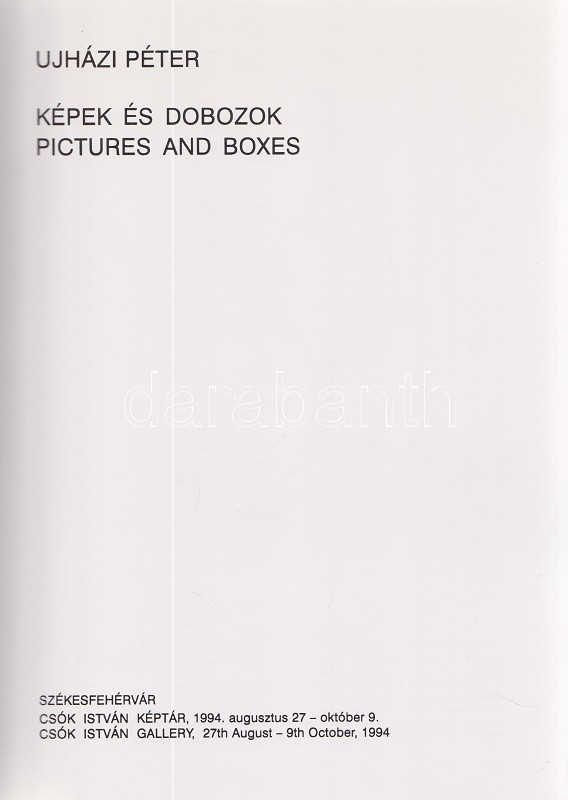 Ujházi Péter: Képek és dobozok. Pictures and Boxes. (Kiállítási katalógus.) [Dedikált.] Székesfehérvár, 1994. Csók István Képtár (ny. n.) [58] p. Egyetlen kiadás. Dedikált: ,,Tarnai Tamás utazónak barátilag Péter, Bukarest. 1995. április 4." A Bernáth Aurélnál tanult, a nonfiguratív neoavantgárd törekvésektől látványosan elkülönülő Ujházi Péter festőművész tárlata 1994. augusztus 27. - 1994. október 9. között volt látható szülővárosában, a székesfehérvári Csók István Képtárban. A bevezető tanulmányt írta és a kiállítást rendezte Sasvári Edit. Kétnyelvű kiállítási katalógusunk 13-46. oldalán a festőművész játékos és groteszk festményeinek és dobozmunkáinak színes reprodukciói, a képanyag után a kiállított művek jegyzéke, valamint életrajzi jegyzetek. (A Szent István Múzeum közleményei. D. sorozat, 226. szám.) Fűzve, Ujházi Péter grafikájával illusztrált kiadói borítóban. Szép példány.