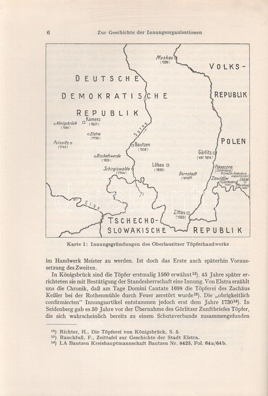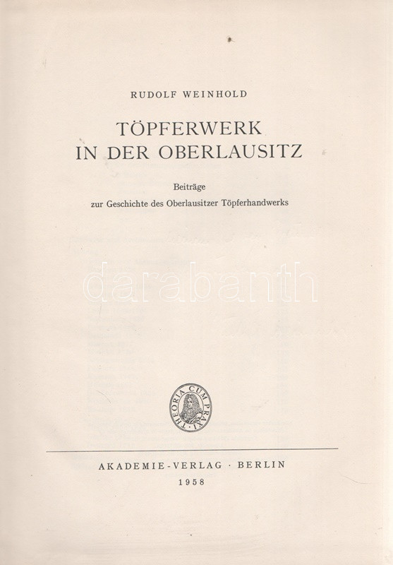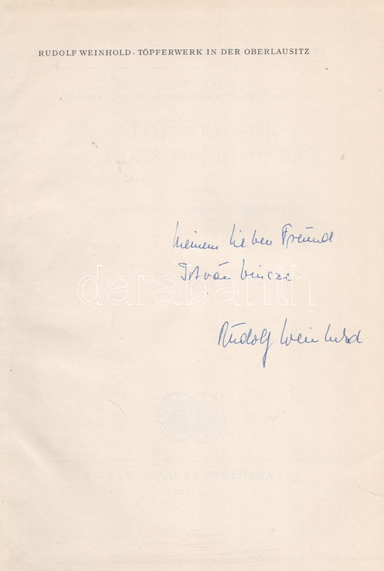Weinhold, Rudolf: Töpferwerk in der Oberlausitz. Beiträge zur Geschichte des Oberlausitzer Töpferhandwerks. (Dedikált.) Berlin, 1958. Akademie-Verlag (VEB Werkdruck, Gräfenhainichen). VIII + 200 + [2] p. + 25 t. (kétoldalas). Dedikált: ,,An meinem lieben Freund István Vincze: Rudolf Weinhold". Rudolf Weinhold (1925-2003) német néprajztudós, elsősorban a népi fazekasság és szőlészet néprajzával foglalkozott. Monográfiája a mai cseh-lengyel-német régióban fekvő Felső-Lausitz fazekasiparának történetét vizsgálja. (Veröffentlichungendes Instituts für Deutsche Volkskunde, Band 18.) Prov.: Prov.: Vincze István. [Vincze István (1922-1982) néprajztudós, 1955-től a Néprajzi Múzeum munkatársa, 1980-től osztályvezetője. Főként szőlészet- és borászattörténettel foglalkozott.] Feliratozott kiadói félvászon kötésben, színes, illusztrált, enyhén sérült kiadói borítóban. Jó példány.