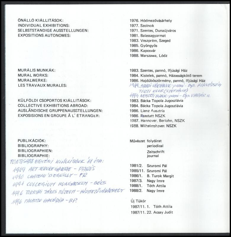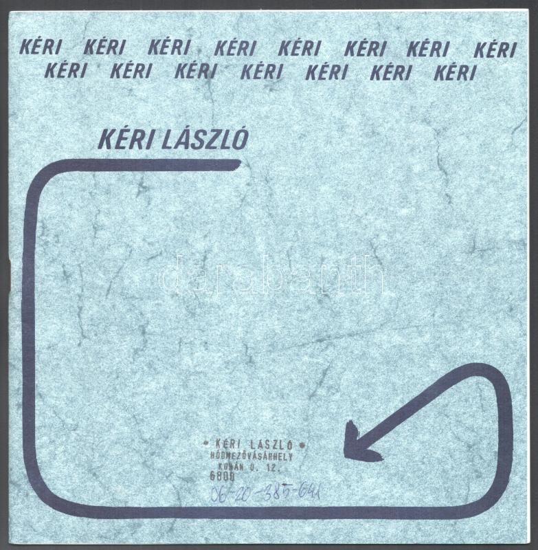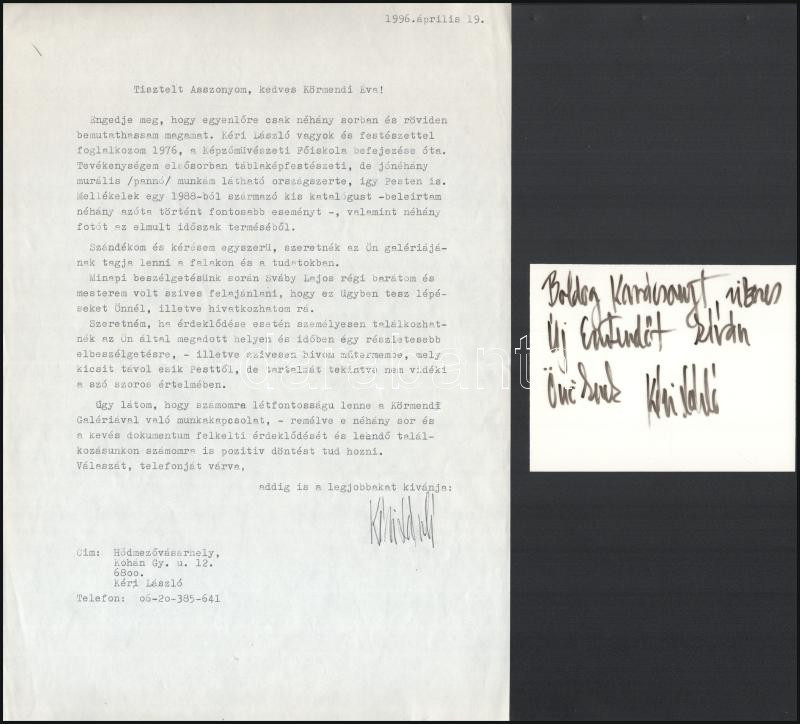 cca 1988 Kéri László. Kiállítási katalógus. hn.,én., nyn., 12 sztl. lev. A művész, Kéri László (1949 - ) Tornyai-díjas festőművész által aláírt példány! A kiállításokat felsoroló résznél autográf kiegészítésekkel. Benne a művész 3 autográf levélével, valamint egy üdvözlő lapjával, rajta autográf soraival. Kiadói papírkötés.