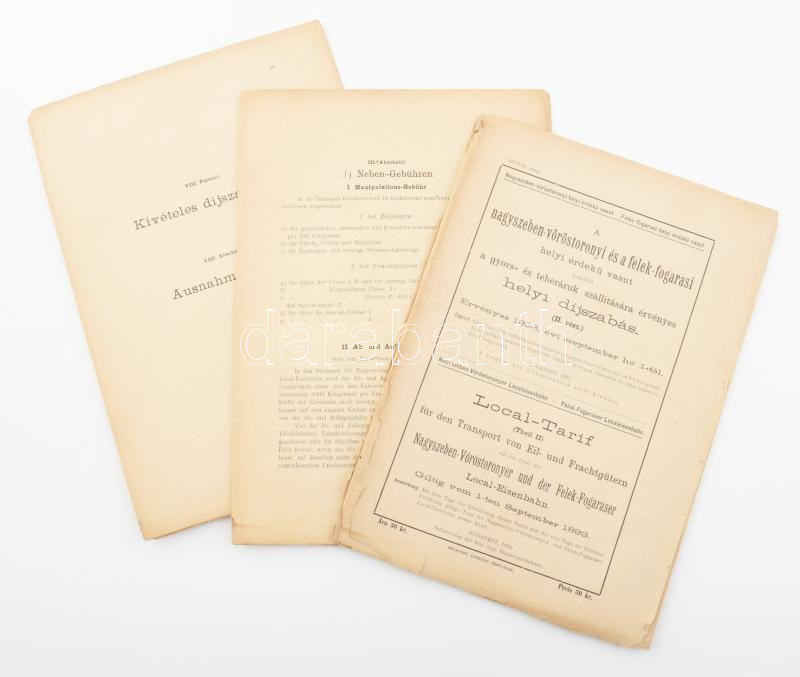 A nagyszeben-vöröstoronyi és a felek-fogarasi helyi érdekü vasut vonalán a gyors- és teheráruk szállitására érvényes helyi díjszabás. (II. rész.) Bp., 1893, M. Kir. Államvasutak (Légrády-ny.), 49+(1) p. Magyar és német nyelven. Fűzés nélkül, sérült, széteső állapotban, egy lap (15-16. old.) hiányzik.