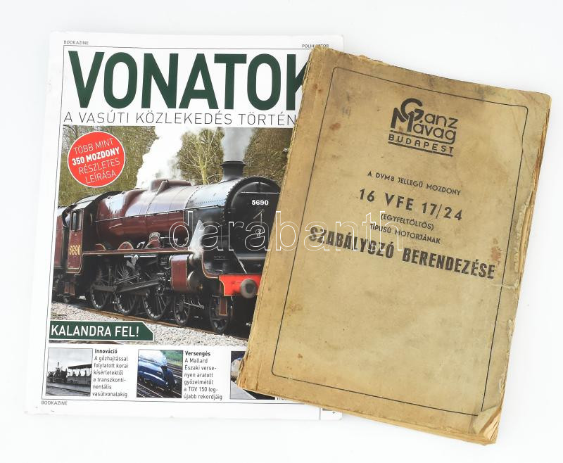 Ganz Mávag A DVM8 jellegű mozdony 16 VFE 17/24 egyfeltöltős típusú motorjának szabályozó berendezése. Bp., 1967 Ganz, sérült papírkötés + Vonatok. A vasúti közlekedés története. Szerk.: Széll Szilvia. Bookazine. Bp., 2018, Kossuth. Gazdag képanyaggal illusztrálva. Kiadói hullámos papírkötés.