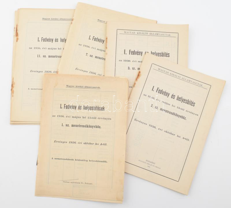 M. kir. államvasutak - Fedvény és helyesbítések az 1936. évi május hó 15-től érvényes menetrendkönyvekhez. (10 db). Bp., 1936, M. Kir. Államvasutak. Kiadói papírkötés, változó állapotban, intézményi bélyegzőkkel.