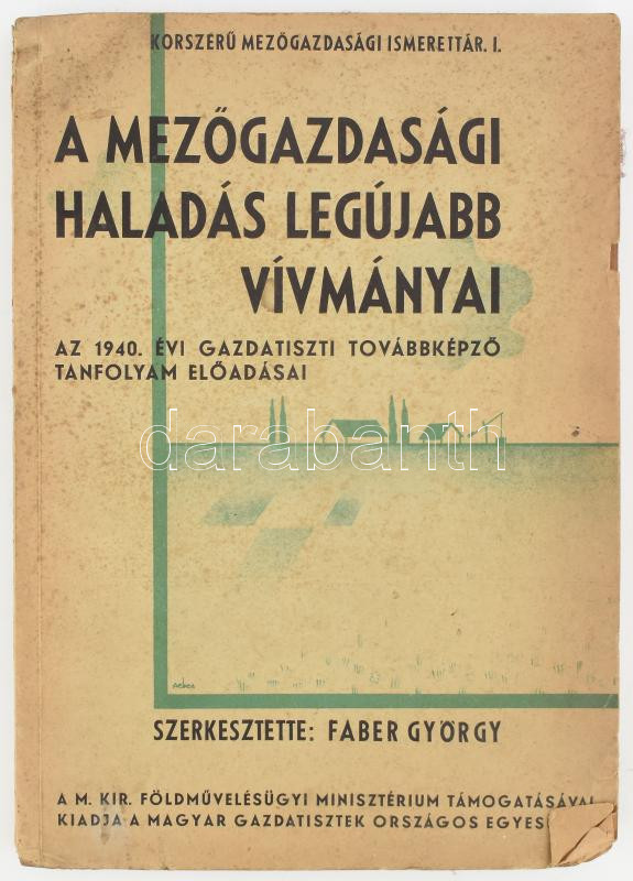 A mezőgazdasági haladás legújabb vívmányai. Szerk.: Faber György. Az 1940. évi gazdatiszti továbbképző-tanfolyam előadásai. Korszerű Mezőgazdasági Ismerettár I. köt. Bp., 1940., Magyar Gazdatisztek Országos Egyesülete, (Pesti Lloyd-ny.), 304 p. Kiadói papírkötés, foltos, szakadt borítóval, a hátsó borító alsó sarkán hiánnyal, sérült gerinccel, a lapok alsó sarkain szamárfülekkel.