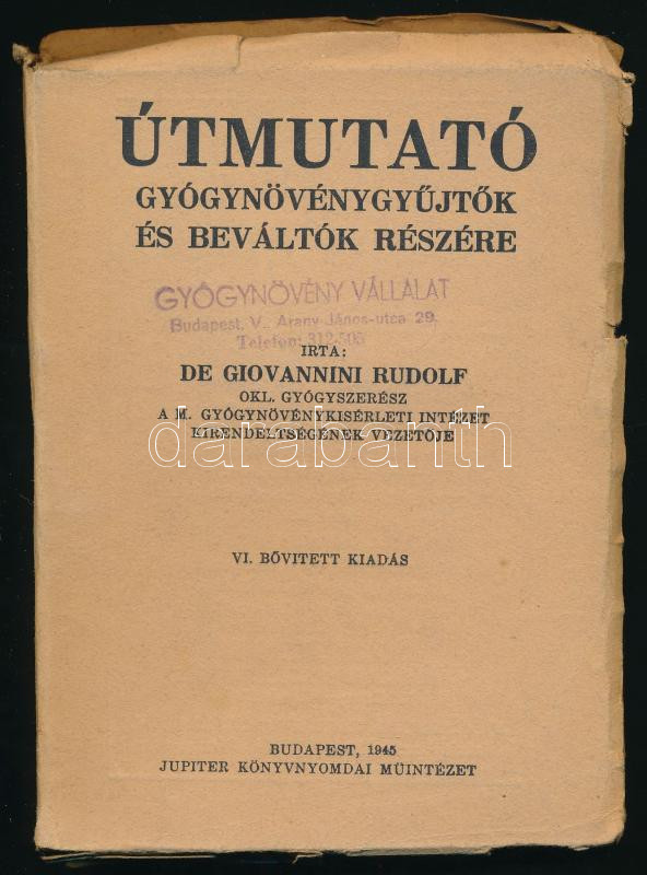 Giovannini Rudolf: Útmutató gyógynövénygyűjtők és beváltók részére. Bp., 1945, Jupiter Könynyomdai Műintézet, 242+2 p. VI., bővített kiadás. Kiadói papírkötés, szakadozott borítóval, sérült, szétvált könyvtesttel.