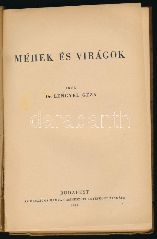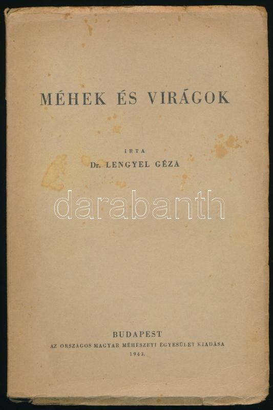 Lengyel Géza: Méhek és virágok. Bp., 1943., Országos Magyar Méhészeti Egyesület, 239 p. Szövetgközti illusztrációkkal. Kiadói papírkötés, sérült gerinccel, foltos borítóval.