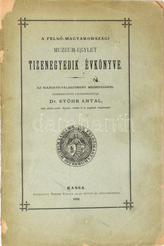 A Felső-Magyarországi Múzeum-Egylet tizenegyedik évkönyve. Szerk. Dr. Stöhr Antal. Kassa, 1892. Kosch és Scharf. 105 p. +1 t (kihajtható) Kiadói papírkötésben sérült gerinccel Benne A kassai magyarság 1554-ik évi panaszleveléről szóló cikk