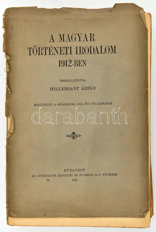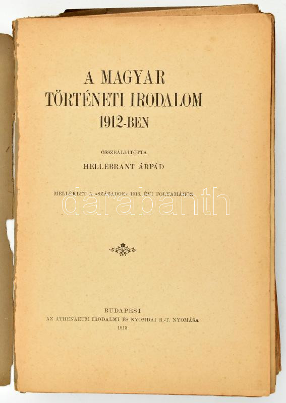 Bp., 1920. Stephaneum ny. 2 sztl. lev. + 55 p. Kiadói papírborítóval, felvágatlan + A Magyar történeti irodalom 1912, 1913, 1915, 1916-ban. szerk: Hellebrant Árpád. Bp., 1912. Athenaeum. a 4 kötet fűzésnél elvált sérült papborítóval