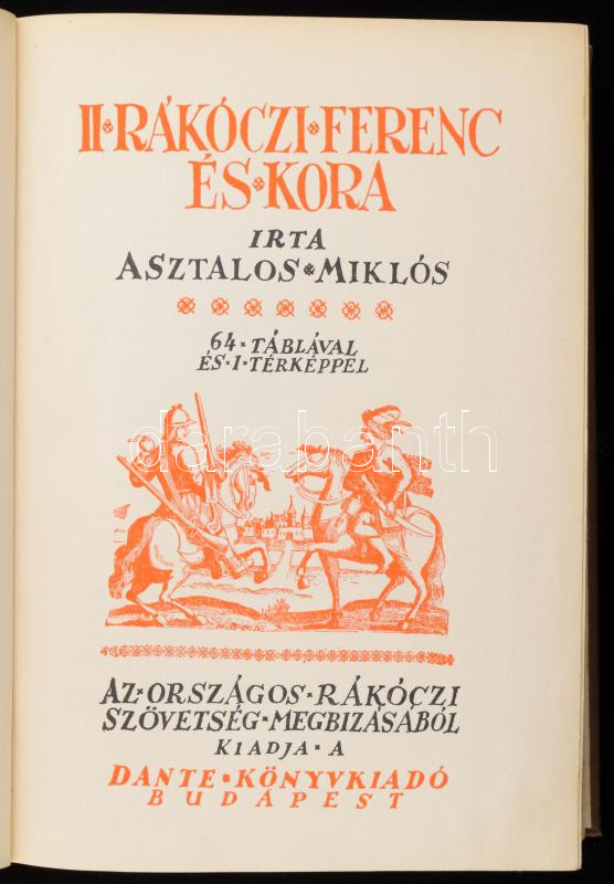 Asztalos Miklós: II. Rákóczi Ferenc és kora. Bp., 1934, Dante,(Hornyánszky Viktor-ny.), 492 p.+ 32 (képtáblák) t. Kiadói aranyozott egészvászon-kötés, kissé kopott borítóval, foltos lapélekkel, hiányzó térképpel.