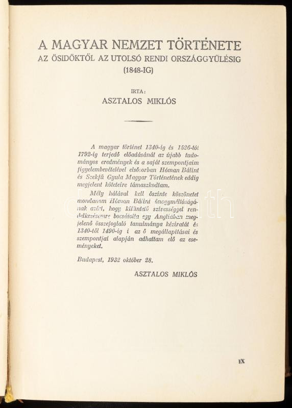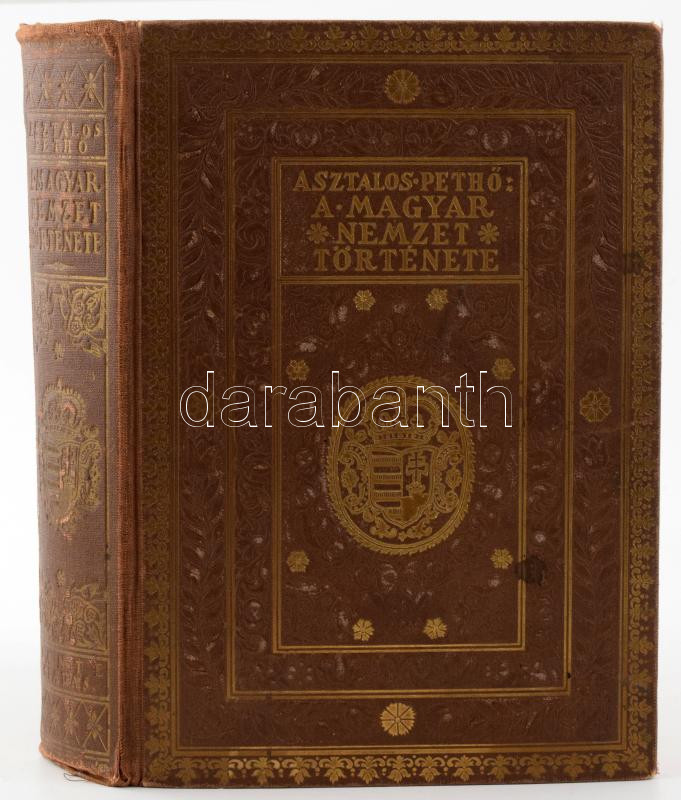 Asztalos Miklós- Pethő Sándor: A magyar nemzet története ősidőktől napjainkig. Bp., 1934, Dante, V-X+560 p.+22 t. 2. kiadás. Kiadói aranyozott egészvászon-kötés, kopott, foltos borítóval, kissé sérült gerinccel, két lap (köztük a címlap) és két tábla hiányzik), két lap kijár.