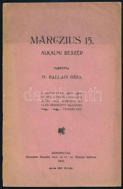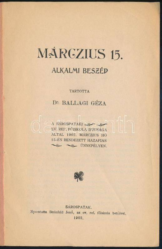 Ballagi Géza: Márczius 15. alkalmi beszéd. Tartotta Dr. - - a Sárospataki Ev. Ref. Főiskola ifjúsága által 1902. márczius hó 15-én rendezett hazafias ünnepélyén. Sárospatak, 1902., Steinfeld Jenő, 24 p. Kiadói papírkötés.