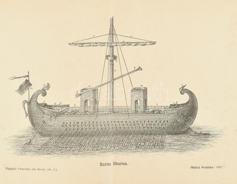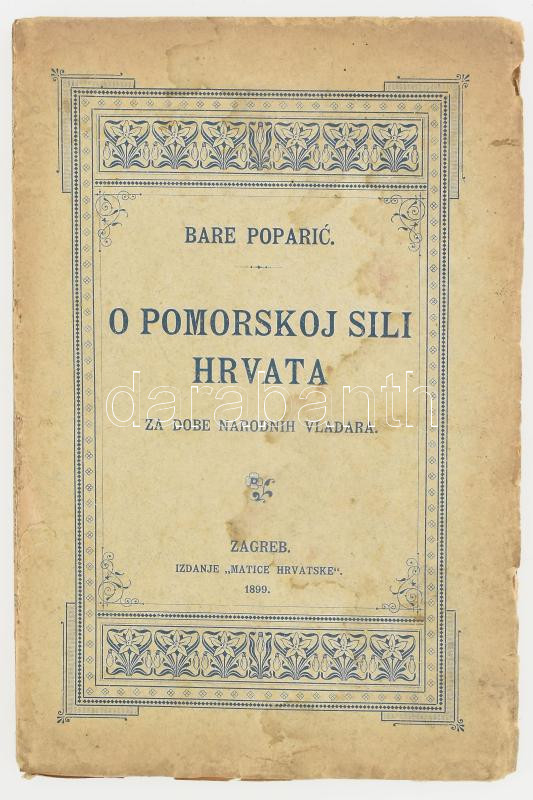 Bare Poparic: O Pomorskoj sili Hrvata za dobe narodnih vladara. Zagreb., 1899, Matica Hrvatske, VIII+140 p. +1 t. Horvát nyelven. Kiadói papírkötés, szakadt, foltos borítóval. Felvágatlan lapokkal.