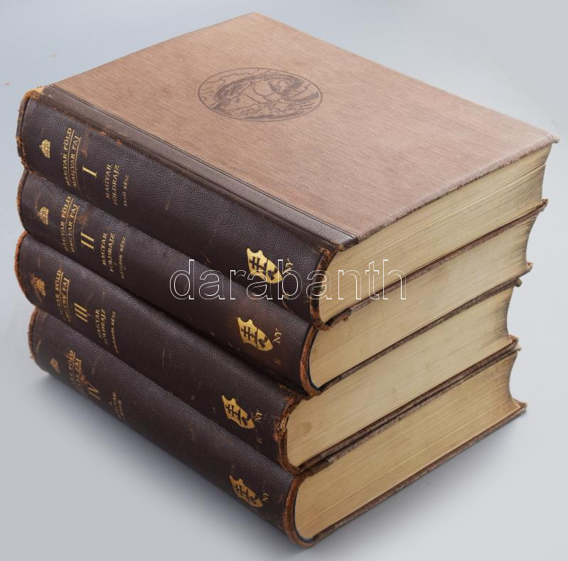 Bartucz Lajos et al.: Magyar föld, magyar faj. 1-4. köt. Bp., [1938-1939], Királyi Magyar Egyetemi Nyomda. Kiadói félbőr-kötésben, kopott borítóval, az I. kötet szétvált (128-129. oldal között.)