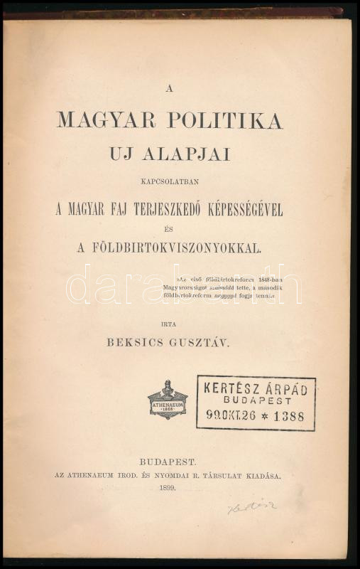 Beksics Gusztáv: A magyar politika új alapjai. Kapcsolatban a magyar faj terjeszkedő képességével és a földbirtokviszonyokkal. Bp., 1899, Athenaeum, VII+175+1 p.+4 t. Átkötött félvászon-kötés, kopott borítóval, ex libris-szel, névbélyegzéssel, szakadt elülső szennylappal.
