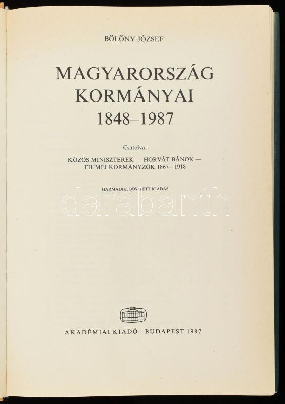 Bölöny József: Magyarország kormányai 1848-1987. (Csatolva: Közös mini... https://www.darabanth.com/de/472-Fernauktion/472.0/Bucher/Bucher-Geschichte~500020/Bolony-Jozsef-Magyarorszag-kormanyai-1848-1987-Csatolva-Kozos-miniszterek-Horvat-ban~II3201767
