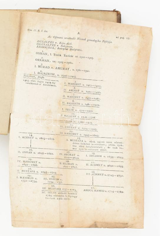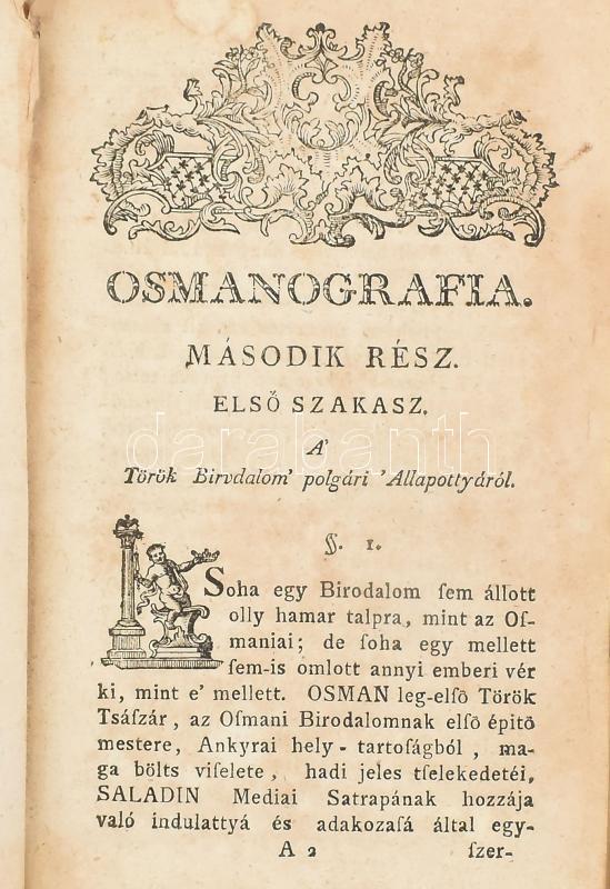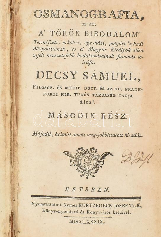 Decsy Sámuel: Osmanografia, az az: a' Török Birodalom' Természeti, erköltsi, egy-házi, polgári 's hadi állapottyának, és a' Magyar Királyok ellen viselt nevezetesebb hadakozásinak summás leirása. Második rész. Bétsben, 1789, Kurtzbeck Jósef, 462+24 p.+ 1 (kihajtható genalógiai táblázat) t. Második, és imitt amott meg-jobbittatott kiadás. Korabeli kopott félbőr-kötésben, sérült, részben hiányos gerinccel, foltos lapokkal, a címlapon névbejegyzéssel.