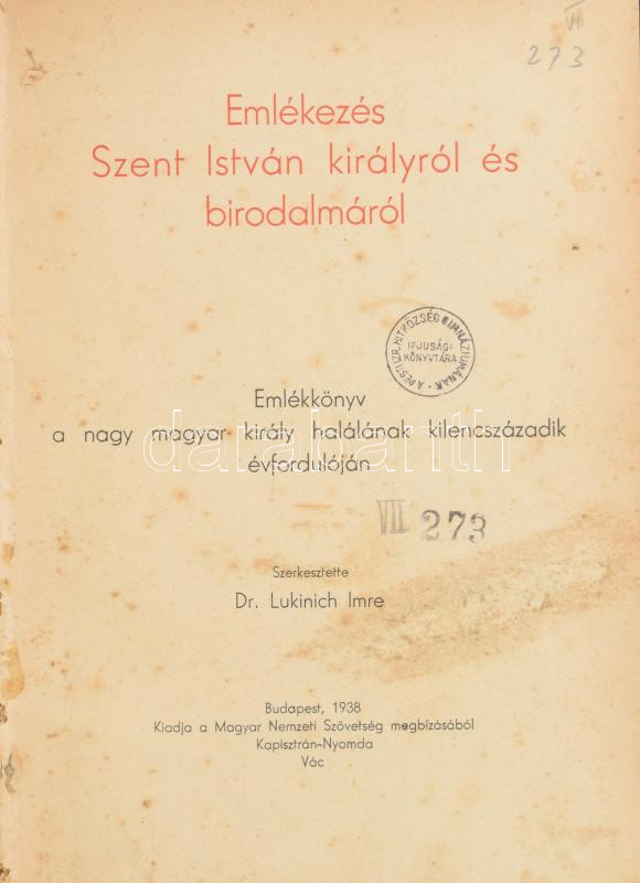 Dr. Lukinich Imre (szerk.): Emlékezés Szent István királyról és birodalmáról. Bp., 1938, Magyar Nemzeti Szövetség. Félvászon kötés, kopottas állapotban.