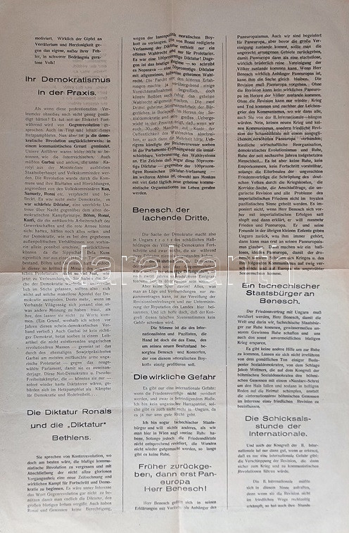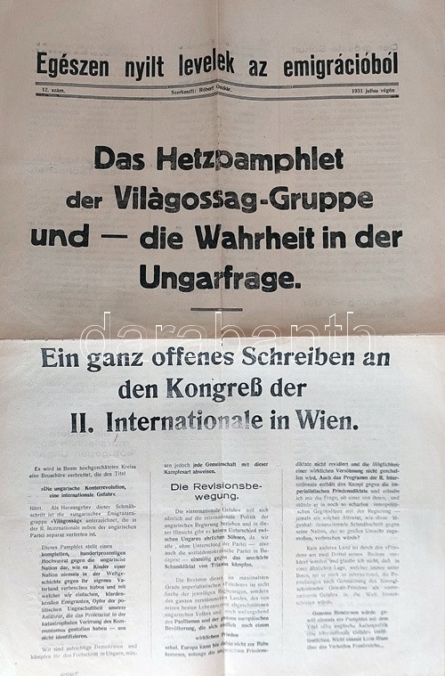 Egészen nyílt levelek az emigrációból. Szerkeszti: Róbert Oszkár. 12. szám. (1931 julius végén.) [Bécs] (Wien), 1931. Druck von Karl Brakl. [4] p. Folio. Az ,,Egészen nyílt levelek az emigrációból" című folyóirat 1930-1932 között jelent meg Bécsben, összesen 17 számban, nagyjából havi rendszerességgel. A lap szerkesztője (és egyetlen szerzője) a Budapestről elszármazott Róbert Oszkár csehszlovákiai magyar újságíró. A szerzőt a háború utolsó évében Budapesten írt ,,Golyó és bitófa" című cikkéért, valamint a Tanácsköztársaság alatt írt cikkei miatt 1920-ban elítélték, jóllehet a szociáldemokrata szerző korántsem rokonszenvezett a kommunista fordulattal, annak második szakaszában élesen szembefordult a totalitárius rezsimmel. Szenvedélyes hangú újságcikkei jobbára egy témát járnak körül - jelen, német nyelvű újságszámában a szerző a bécsi magyar emigráns szociáldemokrata Világosság-csoport politikáját marasztalja el, mivel az - önnön nemzetköziségének igézetében - teljességgel elfeledkezik a határon túli magyarság elnyomott sorsáról, melyet a Beneš-féle Csehszlovákiában élő szerző naponta megtapasztal. Galambos IX. o. Jó állapotú lap, hajtogatva. Rendkívül ritka!