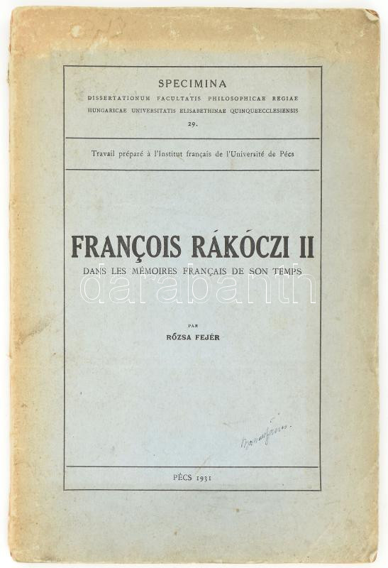 Fejér, Rózsa: François Rákóczi II. dans les mémoires francais de son temps. Specimina Dissertationum Facultatis Philosophicae Regiae Hungaricae Universitatis Elisabethinae Quinqueecclesiensis 29. Pécs, 1931, nyn., 50 p. Francia nyelven. Kiadói papírkötés, szakadt, foltos borítóval.