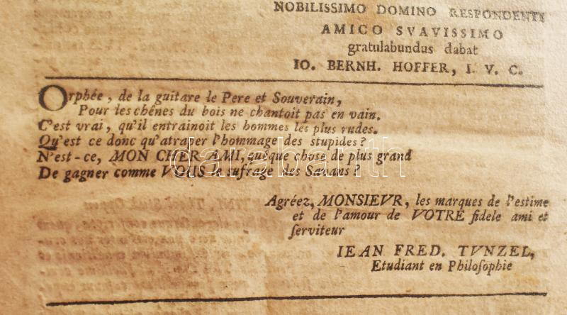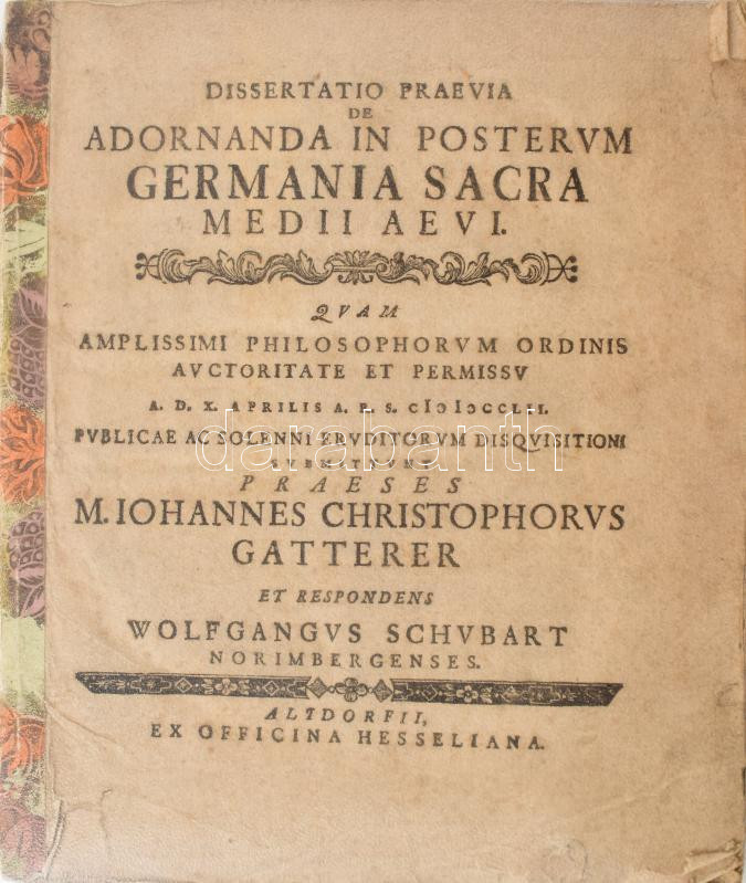 [Gatterer, Johann Christoph (1727-1799): Dissertatio praevia de adornanda in posterum Germania sacra medii aevi. Qvam amplissimi philosophorvm ordinis avctoritate et permissv ... Alidorfii,[1752],Ex Officina Hesseliana, 70+2 p. Korabeli papírkötésben, sérült gerinccel, az első két lap sérült, rajtuk szöveget nem érintő hiánnyal, lapok sarkain szamárfülekkel.