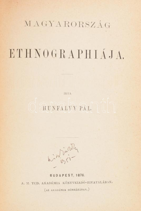 Hunfalvy Pál: Magyarország ethnographiája. Bp., 1876, MTA, (Athenaeum-ny.), XI+3+544 p. Kiadói aranyozott egészvászon-kötés, kopott borítóval, kissé sérült gerinccel, régi intézményi bélyegzéssel és névbejegyzésekkel, a hátsó kötéstáblán ragasztásnyomokkal és ki