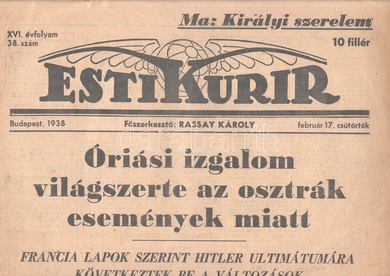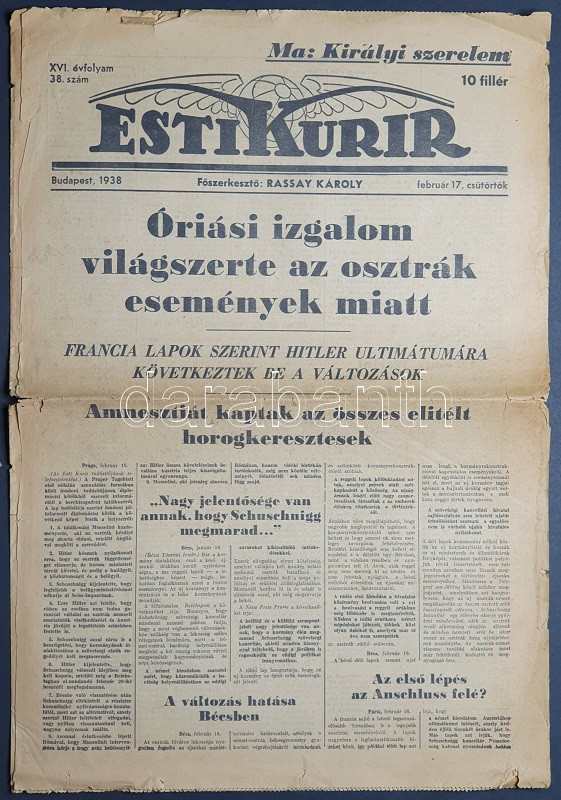 [II. Világháború] Esti Kurir. 1938. február 17. (Napilap, XVI. évfolyam, 38. szám) "Óriási izgalom világszerte az osztrák események miatt -- Amnesztiát kaptak az összes elitélt horogkeresztesek -- Az első lépés Anschluss felé?". Félbehajtva, jó állapotban, első levélpár hajtásnál szétnyílva.