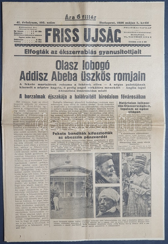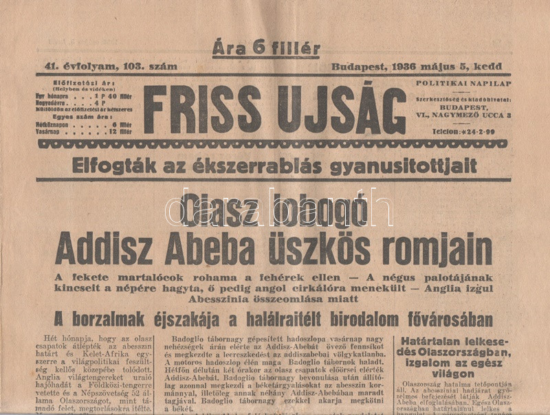 [II. Világháború] Friss Ujság. 1936. május 5. (Napilap, 41. évfolyam, 103. szám) "Olasz lobogó Addisz Abeba üszkös romjain -- A borzalmak éjszakája a halálraitélt birodalom fővárosában -- Mussolini a mozgósított Olaszország előtt jelenti be a győzelmet". Félbehajtva, jó állapotban, az utolsó levélen két apróhirdetés kivágva.