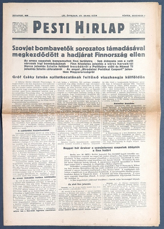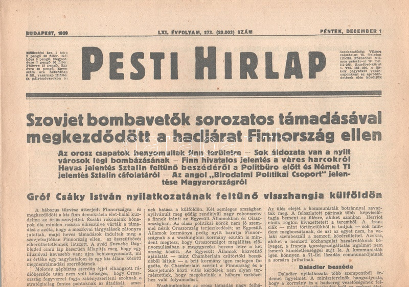 [II. Világháború] Pesti Hirlap. 1939. december 1. (Napilap, LXI. évfolyam, 273. szám) "Szovjet bombavetők sorozatos támadásával megkezdődött a hadjárat Finnország ellen -- Az orosz csapatok benyomultak finn területre -- Sok áldozata van a nyílt városok légi bombázásának -- Finn hivatalos jelentés a véres harcokról -- Havas jelentés Sztalin feltűnő beszédéről a Politbüro előtt és Német TI jelentés Sztalin cáfolatáról -- Az angol "Birodalmi Politikai Csoport" jelentése Magyarországról -- Gróf Csáky István nyilatkozatának feltűnő visszhangja külföldön" Félbehajtva, jó állapotban.